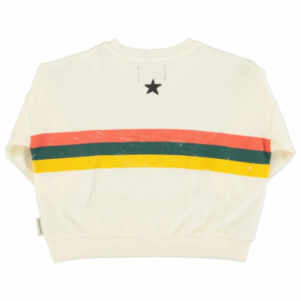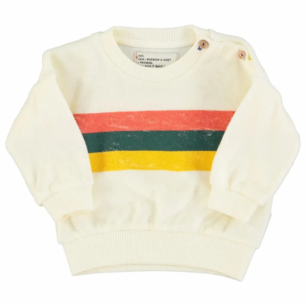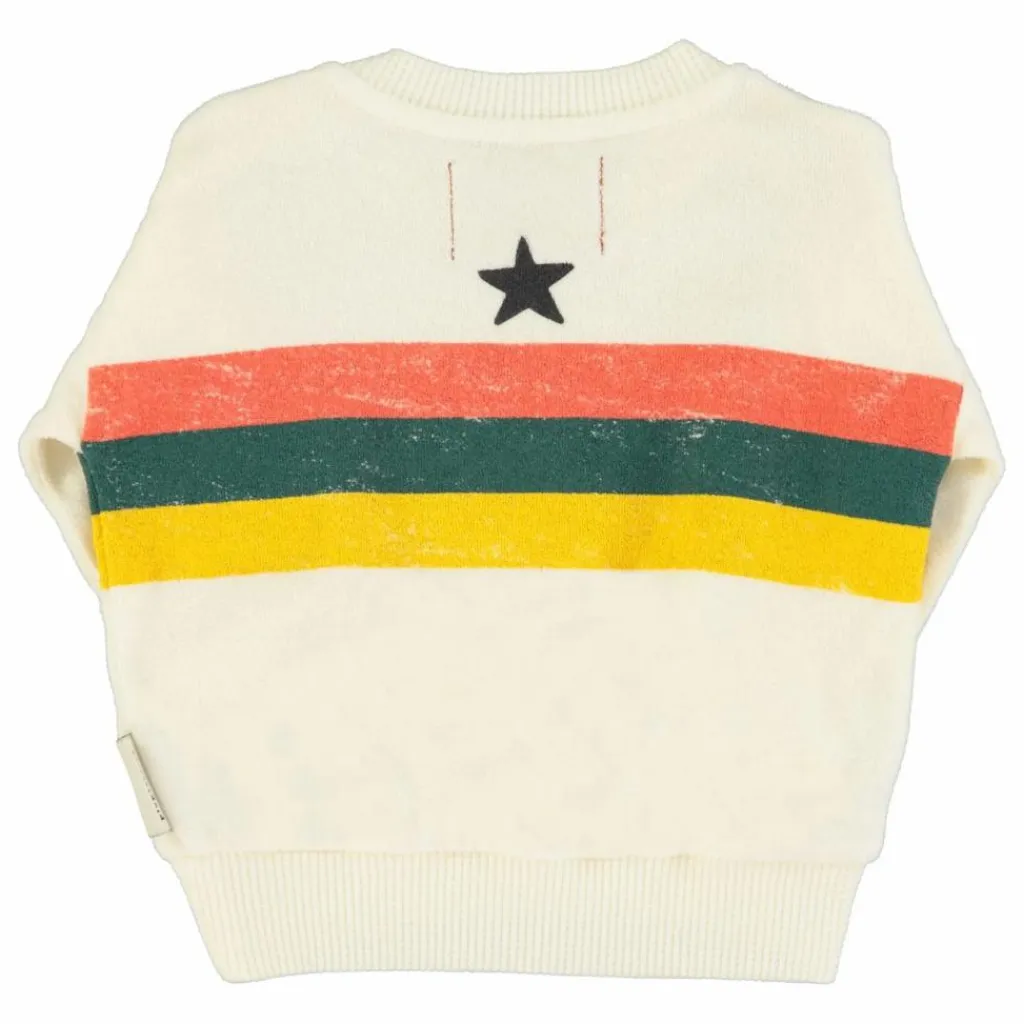 - Sweat en coton éponge biologique à rayures multicolores et ourlets côtelés. Il est agrémenté d’un logo noir en forme d’étoile au dos.