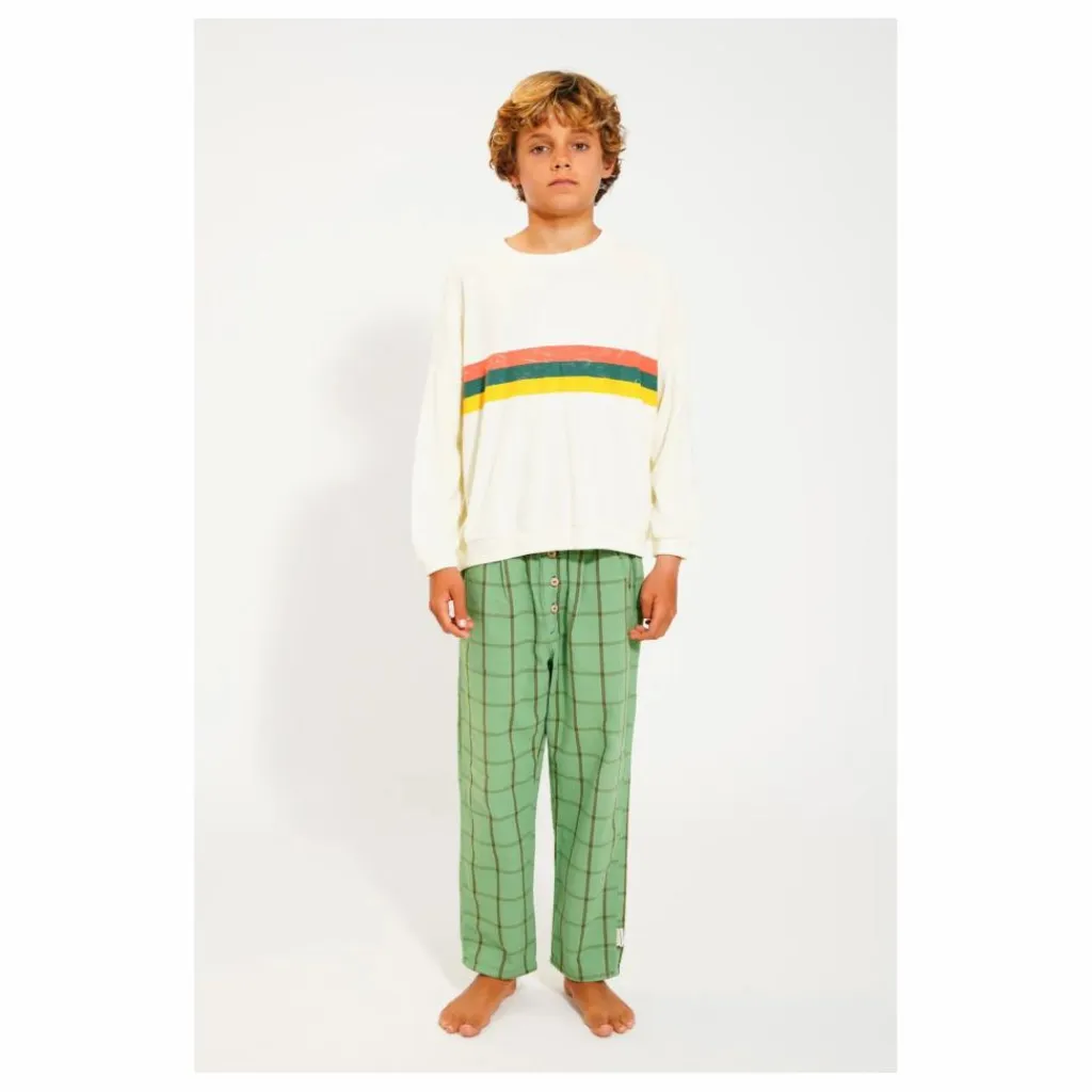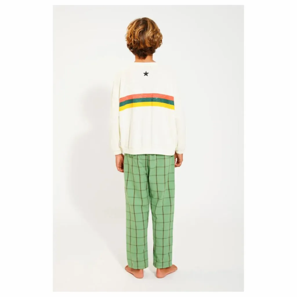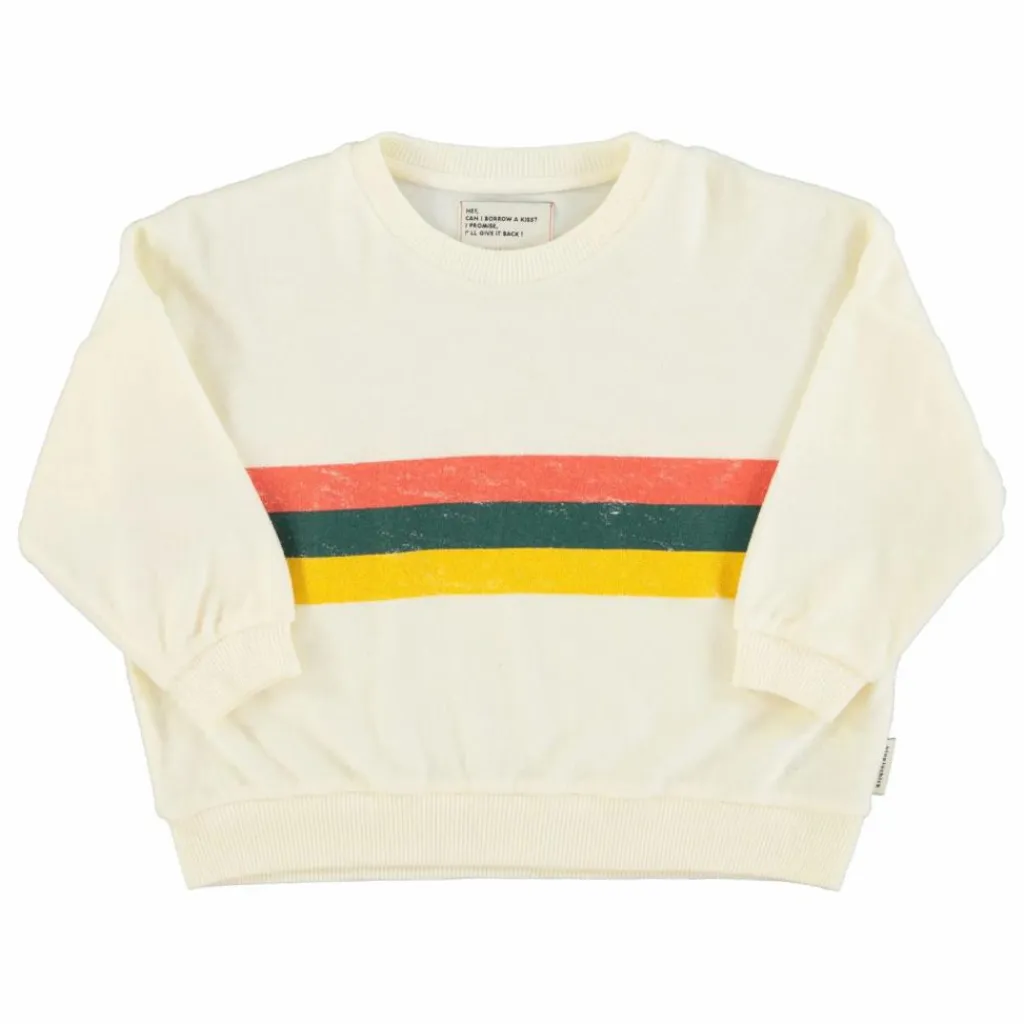 - Sweat en coton éponge biologique à rayures multicolores et ourlets côtelés. Il est agrémenté d’un logo noir en forme d’étoile au dos.