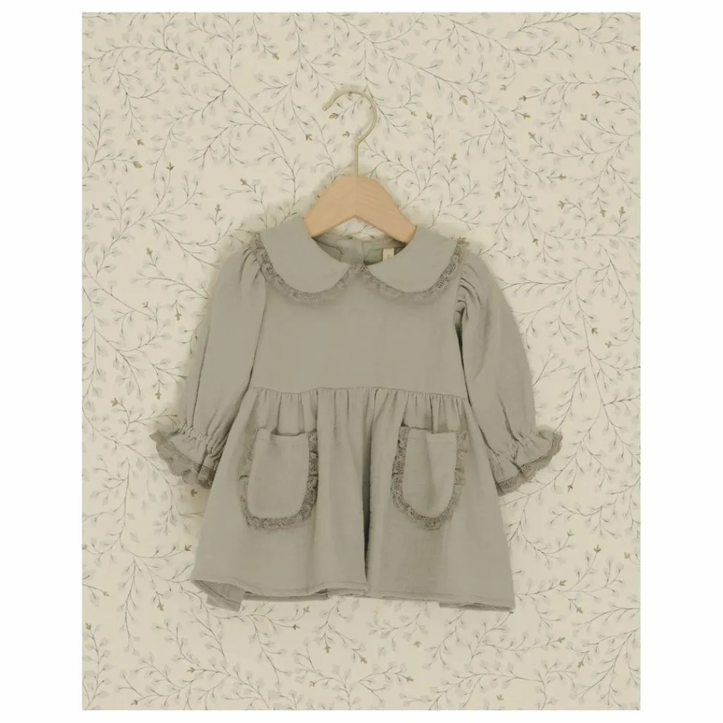 - La robe Marisol est dotée d’un col Peter Pan, de poches plaquées et de manches froncées, le tout orné d’un délicat volant de dentelle, et de boutons en noix de coco au dos pour faciliter l’habillage. Les culottes bouffantes coordonnées sont incluses dans toutes les tailles, dans notre teinte « bleu acier ».