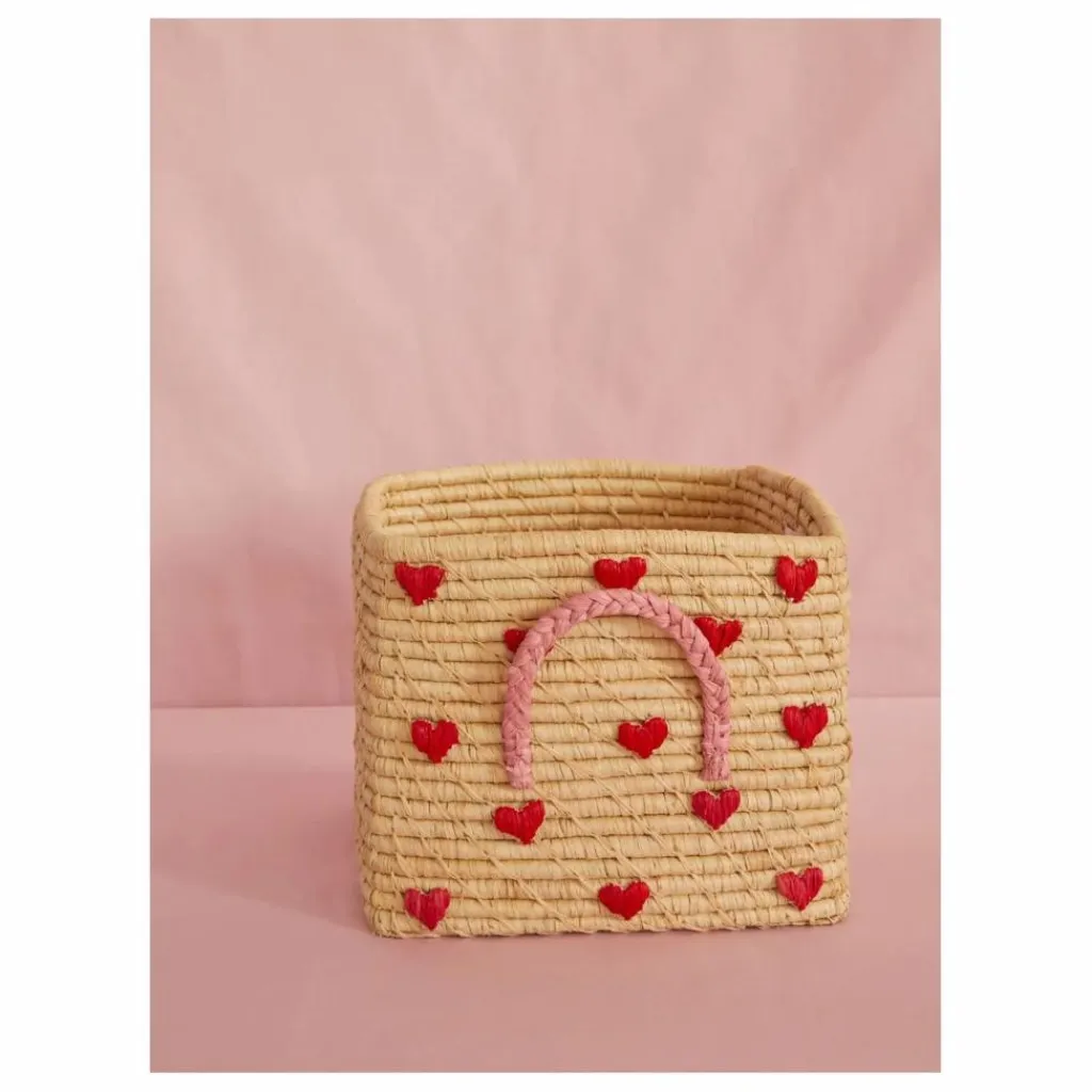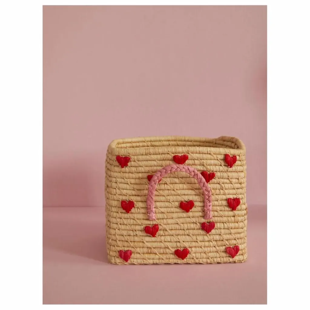 - Panier carré en raphia avec anses en raphia – Coeurs