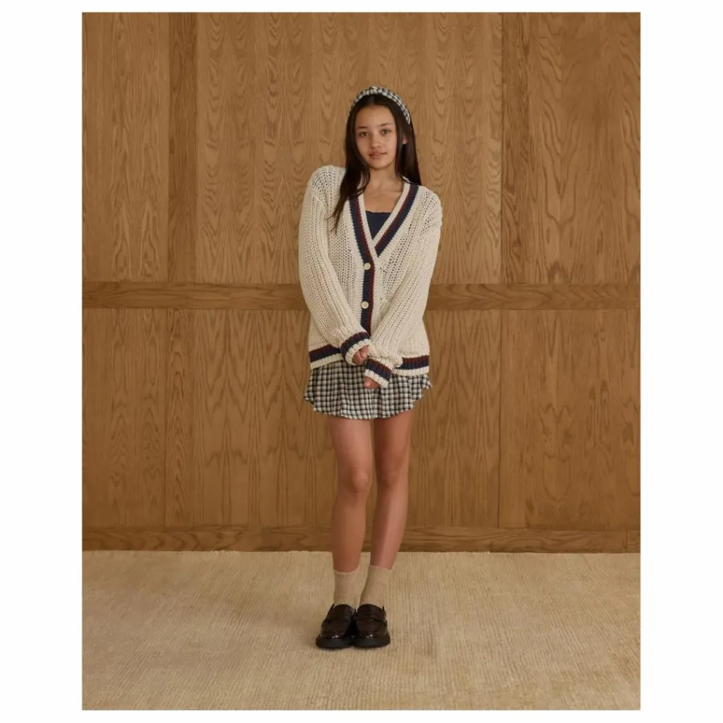 - Cardigan à col en V doté de poches avant, de boutons en bois de manguier et de rayures contrastées le long de l’encolure, de l’ourlet et des poignets pour un look collégial cool.