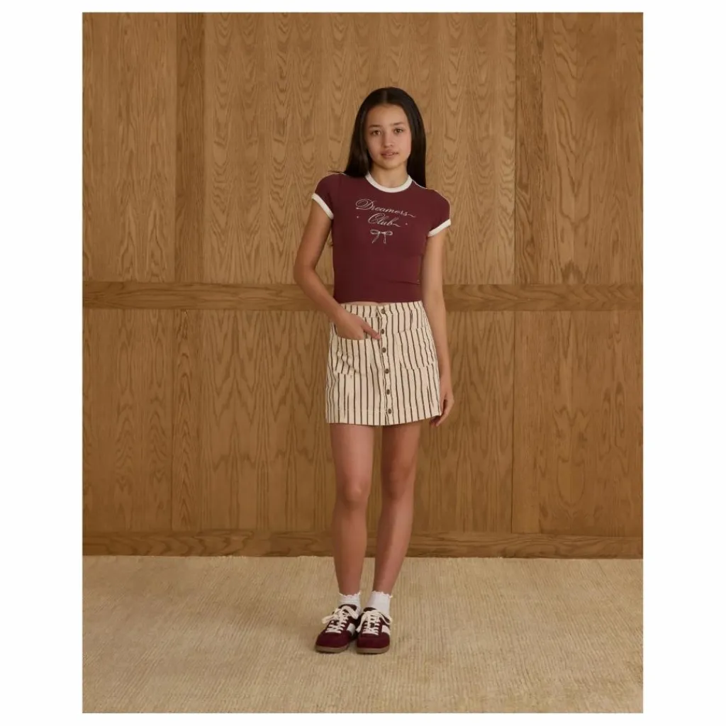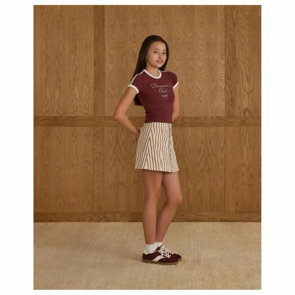 - Baby Tee à rayures contrastées à l’encolure, aux épaules et aux manches pour un look sportif et original, avec notre imprimé « dreamers club » sur notre teinte « burgundy ».