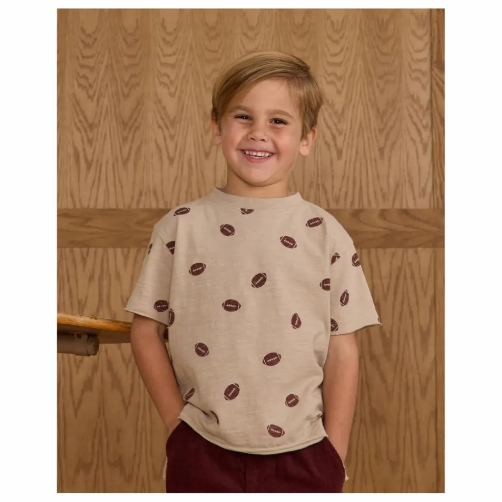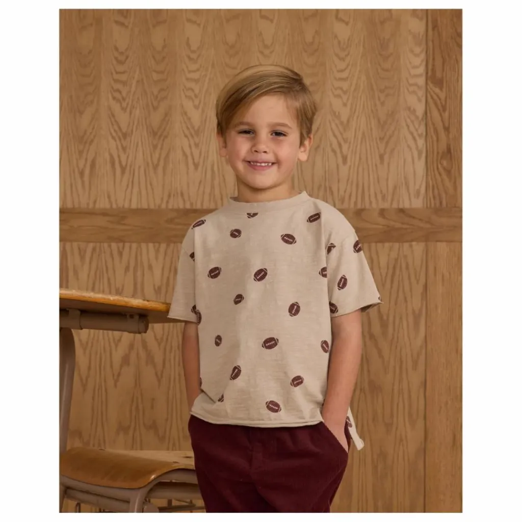 - Ce tee-shirt confortable en coton présente un ourlet à bords bruts pour un look décontracté. Des boutons-pression aux épaules sont inclus dans les tailles 0-3M – 18-24M pour faciliter les changements. Avec notre imprimé « football » sur notre teinte « stone ».