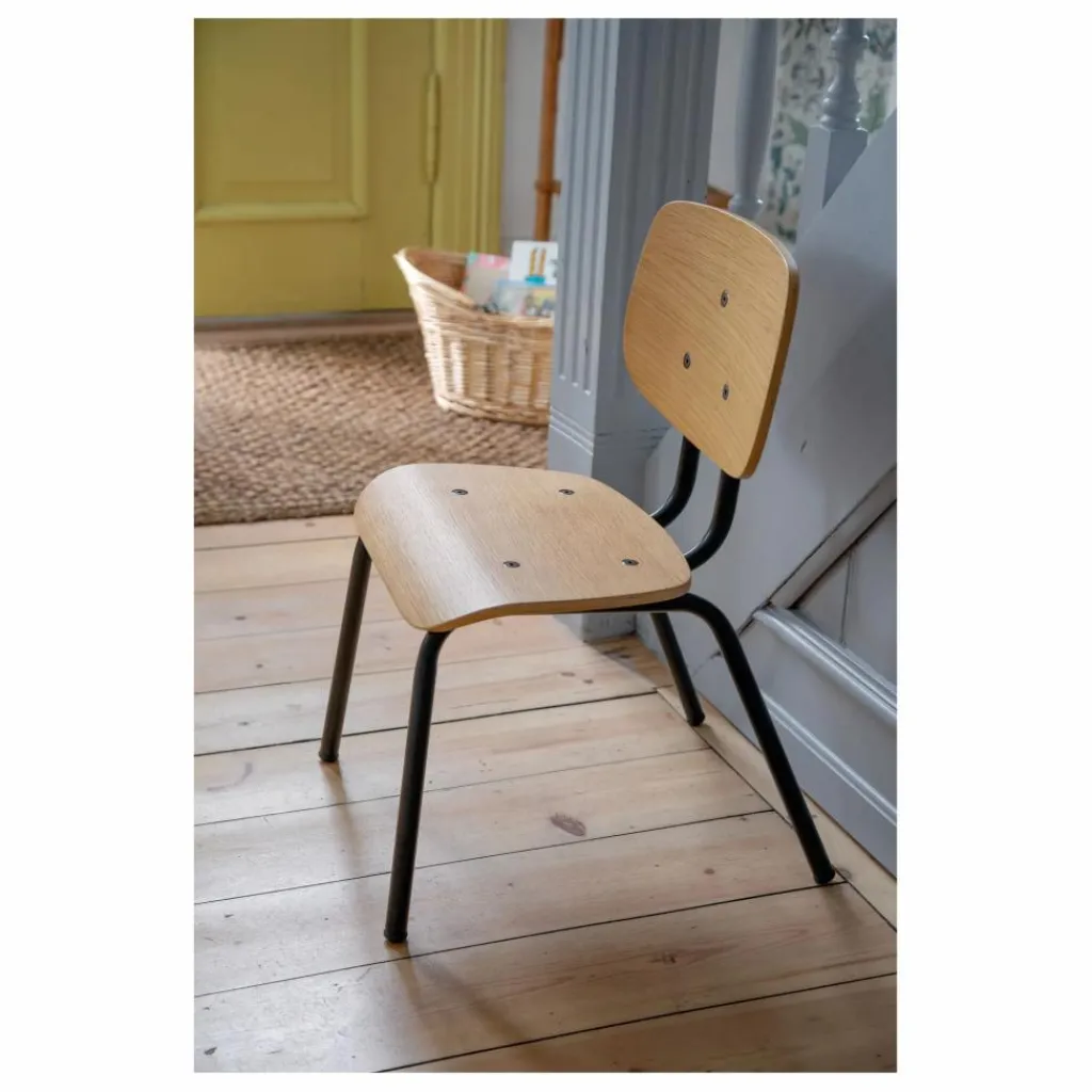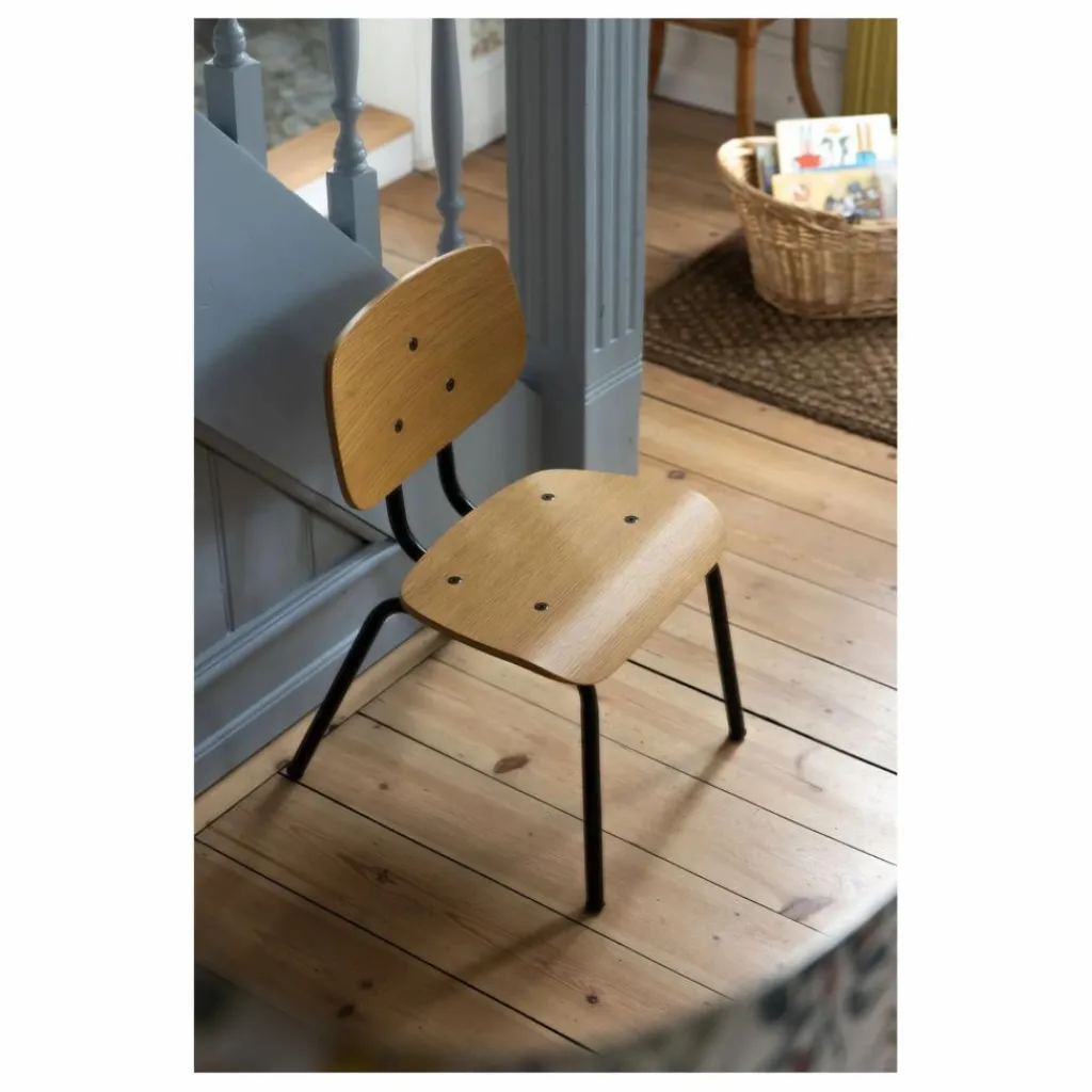 Elle est dotée de quatre pieds en métal thermolaqué noir mat, d’une belle assise et d’un dossier en placage chêne. Avec ses coins arrondis, elle s’intègre facilement dans la chambre d’enfant, mais peut aussi être utilisée dans l’entrée ou dans toute autre pièce de la maison.