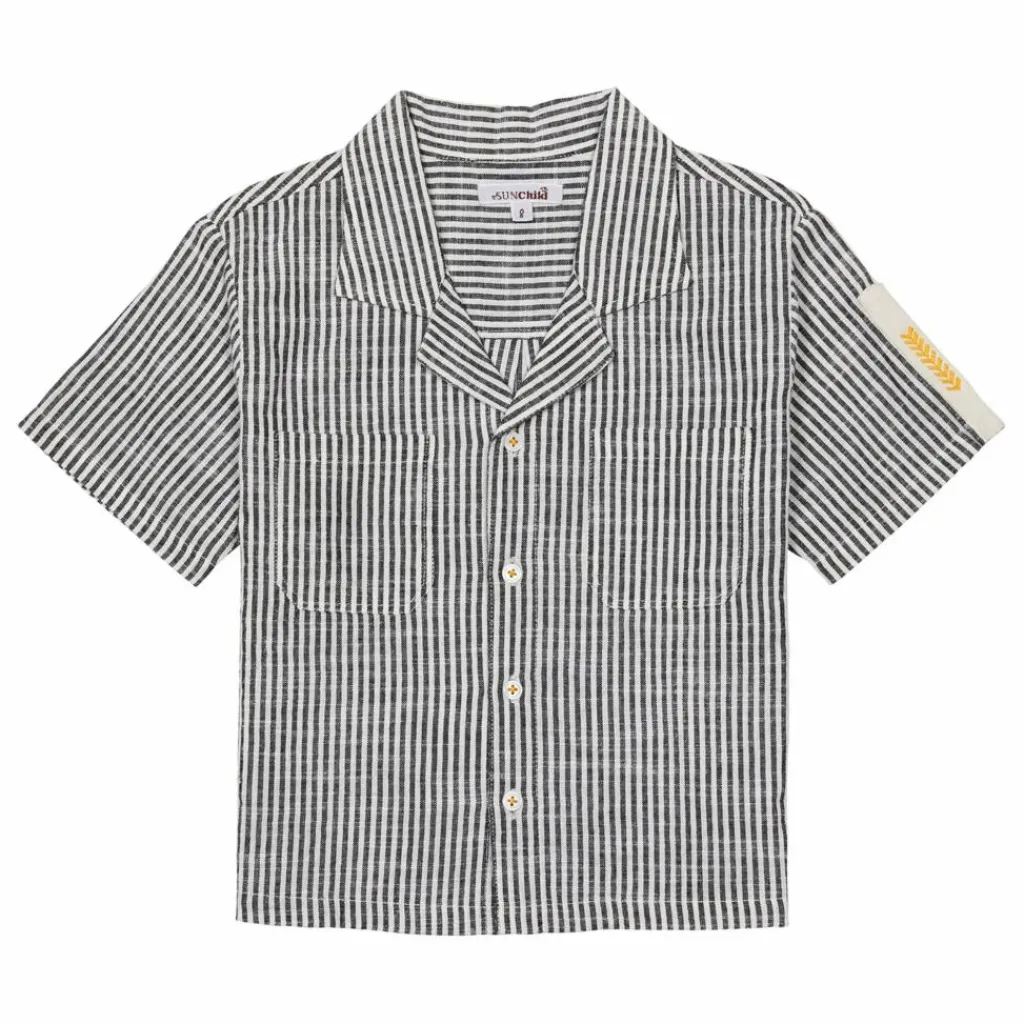 - Motif à rayures verticales noires et blanches. Col à revers ouvert. Poches plaquées sur la poitrine. Fermeture à boutons. Manches courtes. Écusson sur la manche gauche