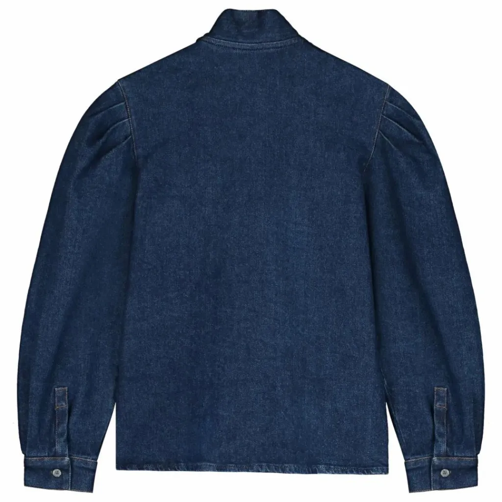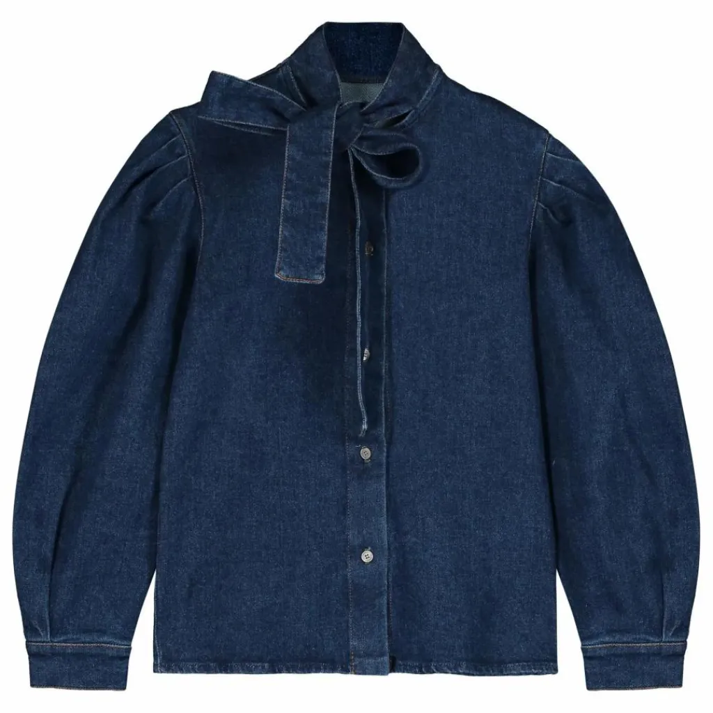 - – Denim lavé à la pierre – Coutures contrastées et nœud papillon à l’encolure – Épaules plissées et poignets boutonnés