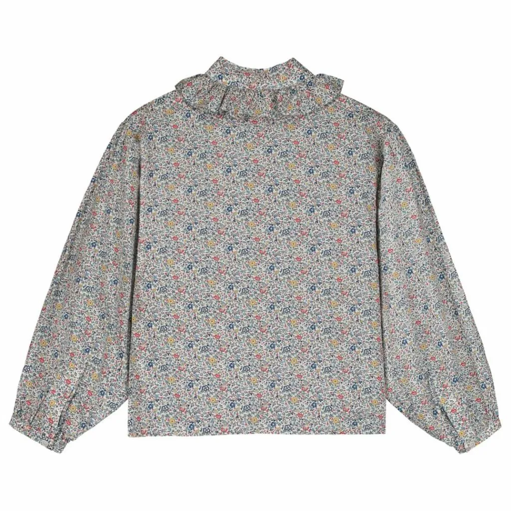 - Chemisier à manches longues en coton Liberty. Coupe décontractée, col mao et fronces volantées, fermeture et poignets boutonnés.