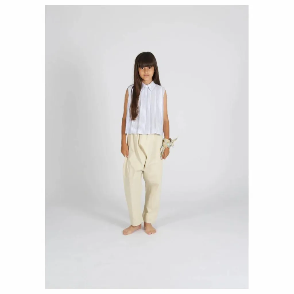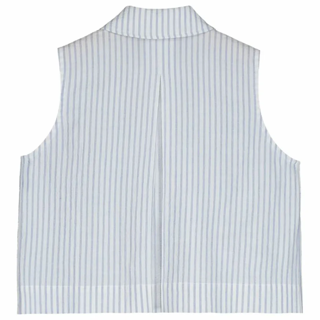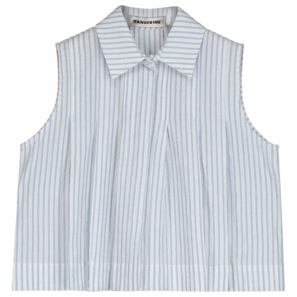 - Chemisier plissé en seersuker, doté d’un col classique et d’une fermeture boutonnée sur le devant.