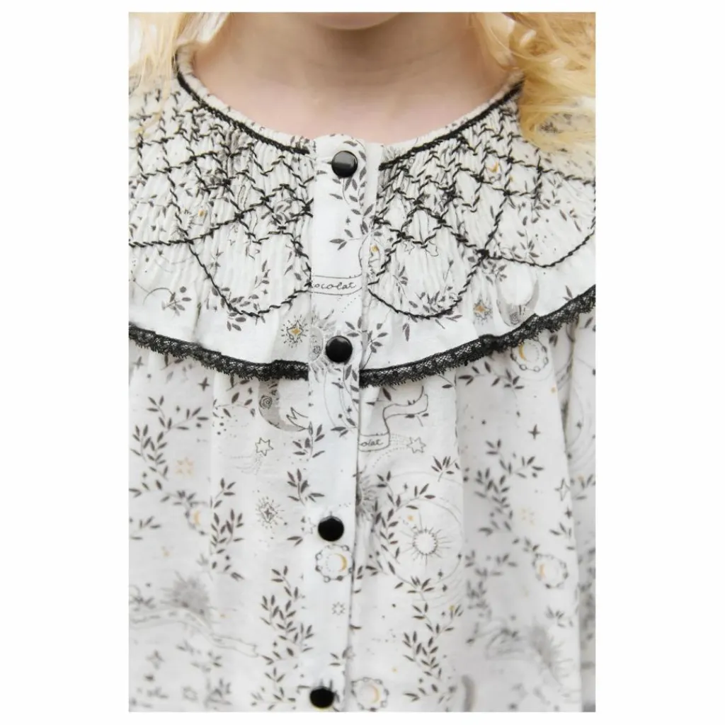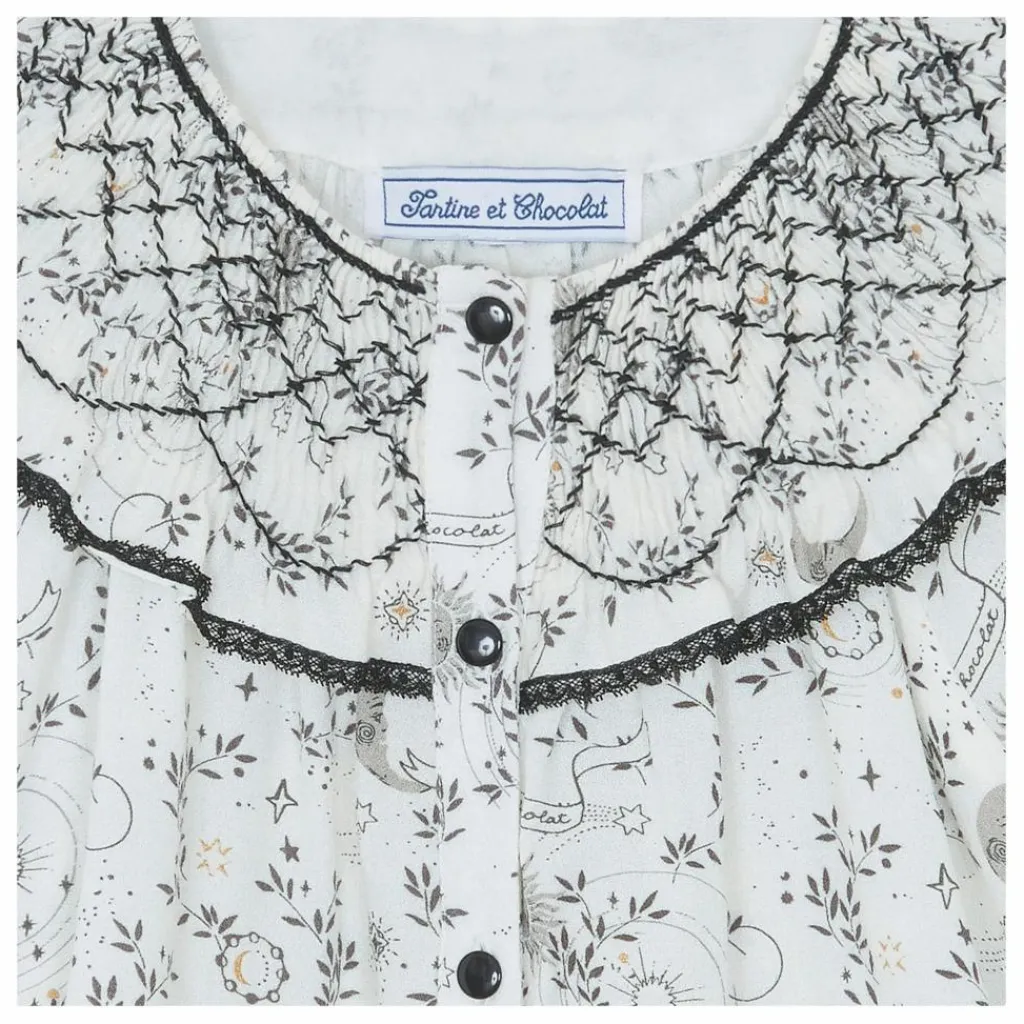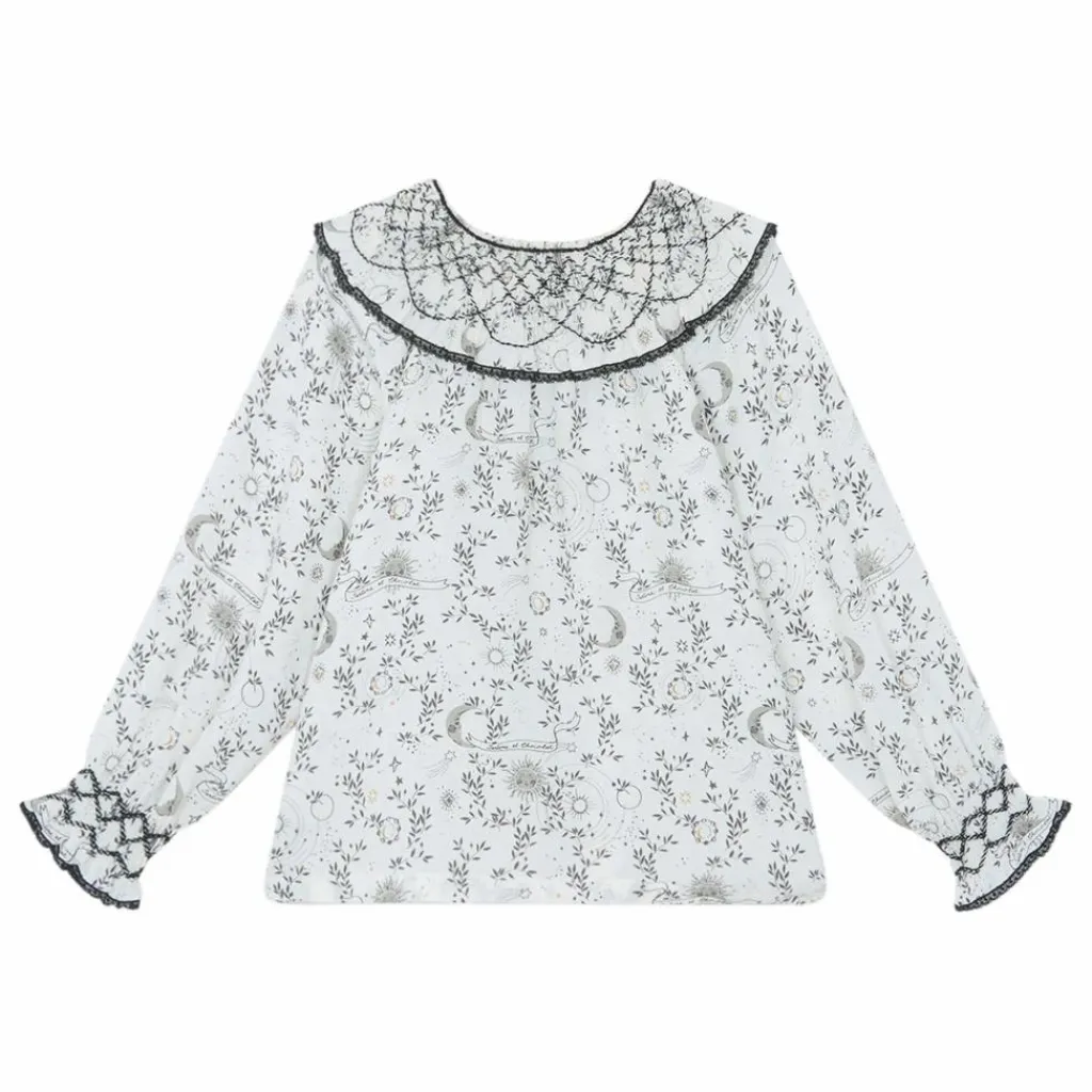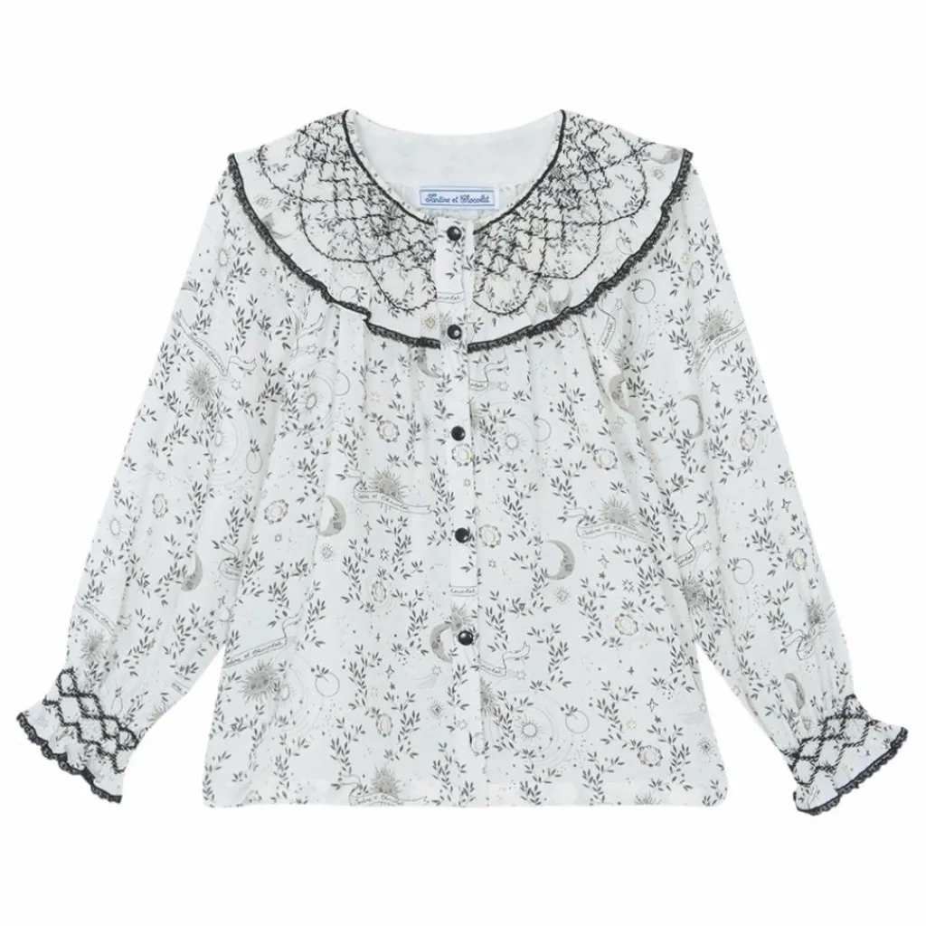 - Cette tunique pour junior fille séduit par son col volanté et ses poignets délicatement brodés à la main, ajoutant une touche de raffinement et de finesse. Rehaussée de motifs « Rêve étoilé » disséminés sur toute la tunique, elle invite à la douceur et à la poésie. Une pièce élégante et intemporelle, parfaite pour accompagner les jeunes filles avec charme et délicatesse.