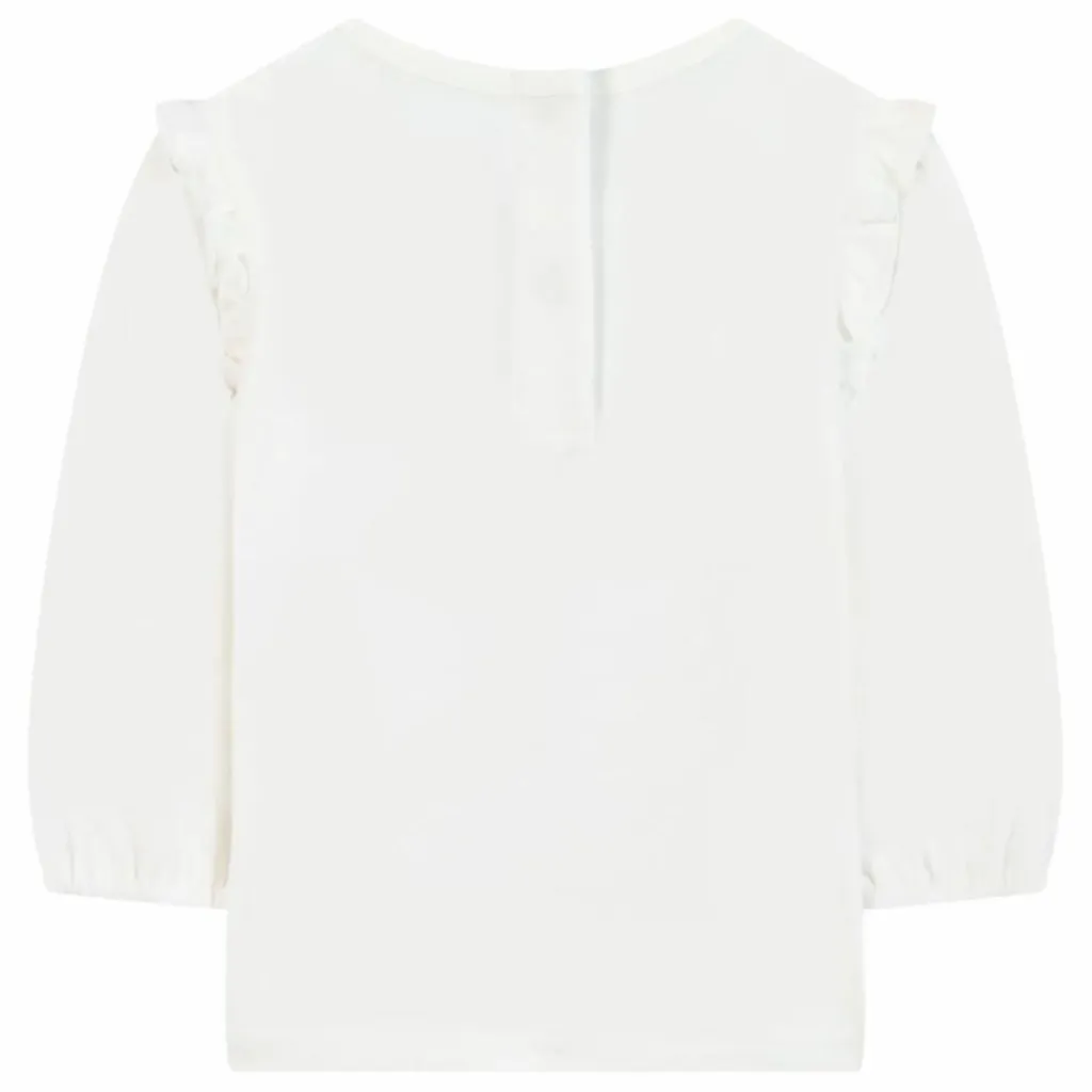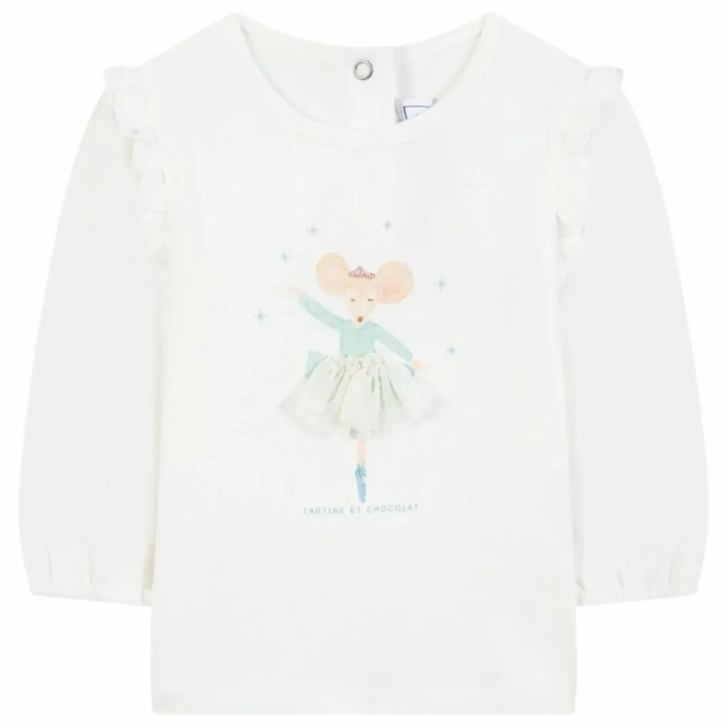 - Ce t-shirt manches longues écru pour bébé fille, orné d’une illustration poétique d’une souris en danseuse classique, apporte une touche de douceur et de légèreté à la garde-robe hivernale. Confectionné dans une matière douce, il assure un confort optimal pour les petites explorations de bébé. Facile à associer avec un short en tweed ou un legging, il crée une tenue à la fois élégante et chaleureuse pour l’hiver.