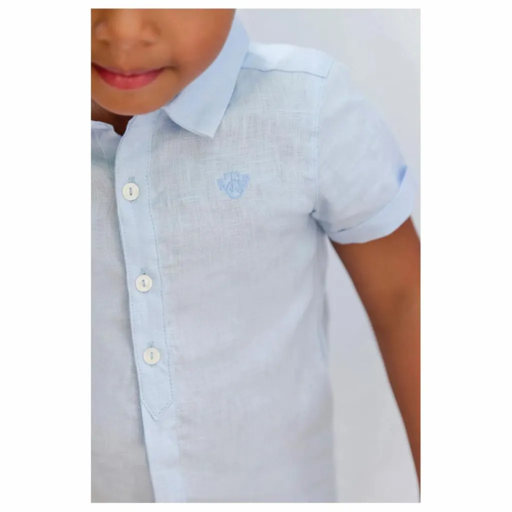 - Cette chemise blanche en lin à manches courtes et col pointu est idéale pour une cérémonie estivale. Son élégance naturelle et sa légèreté habillent les petits garçons avec style et confort. À associer avec un pantalon chic pour un look raffiné et distingué, idéal pour les moments spéciaux de bébé.