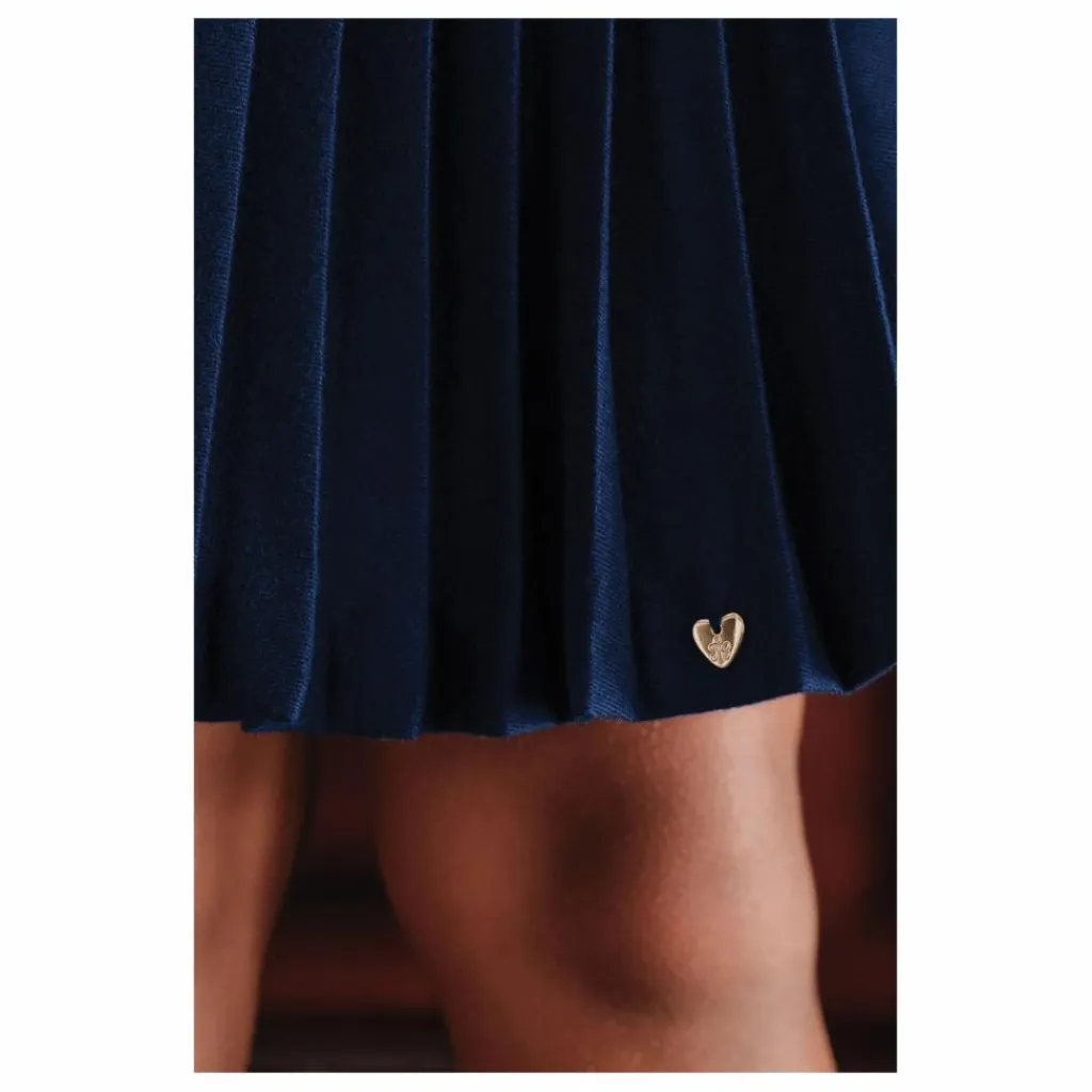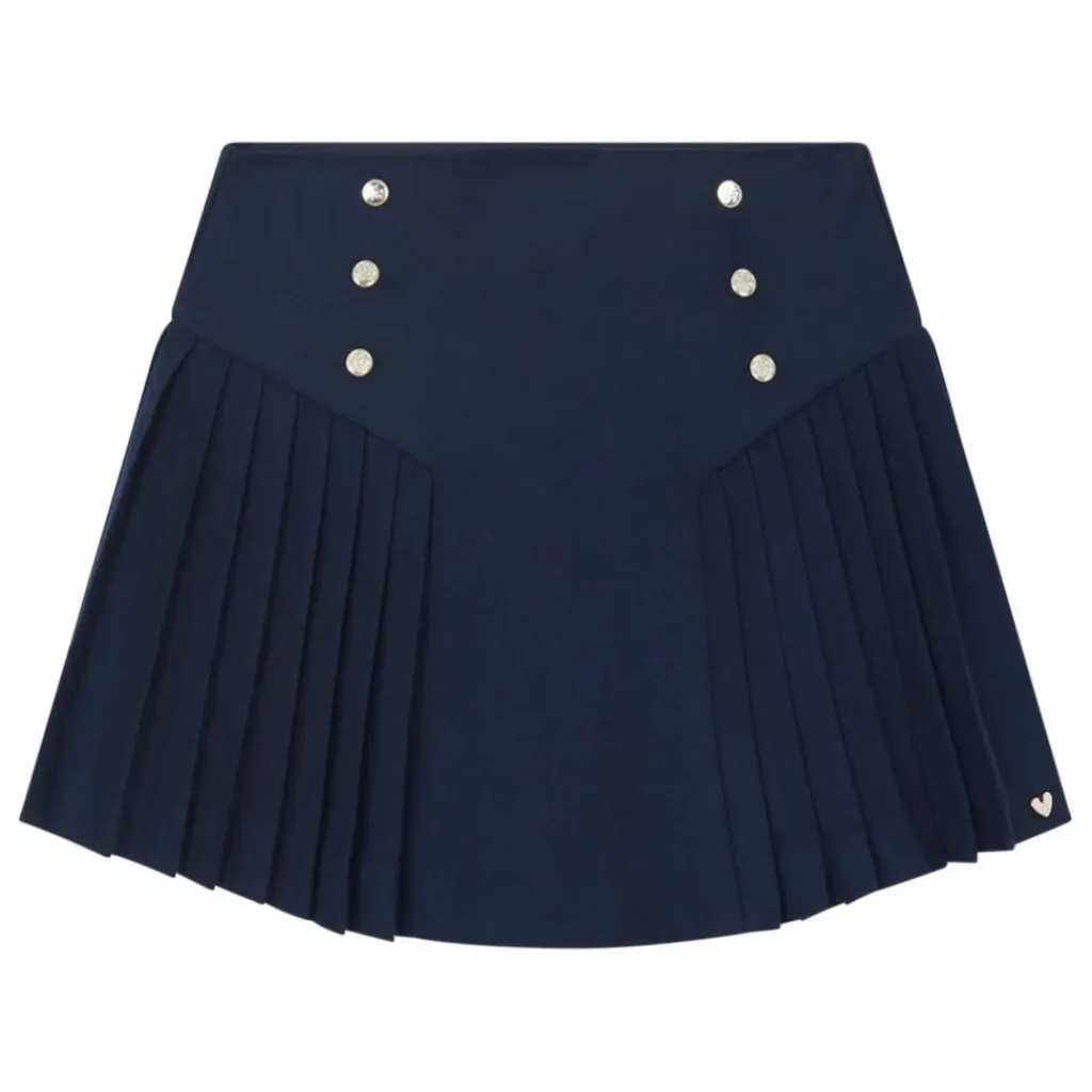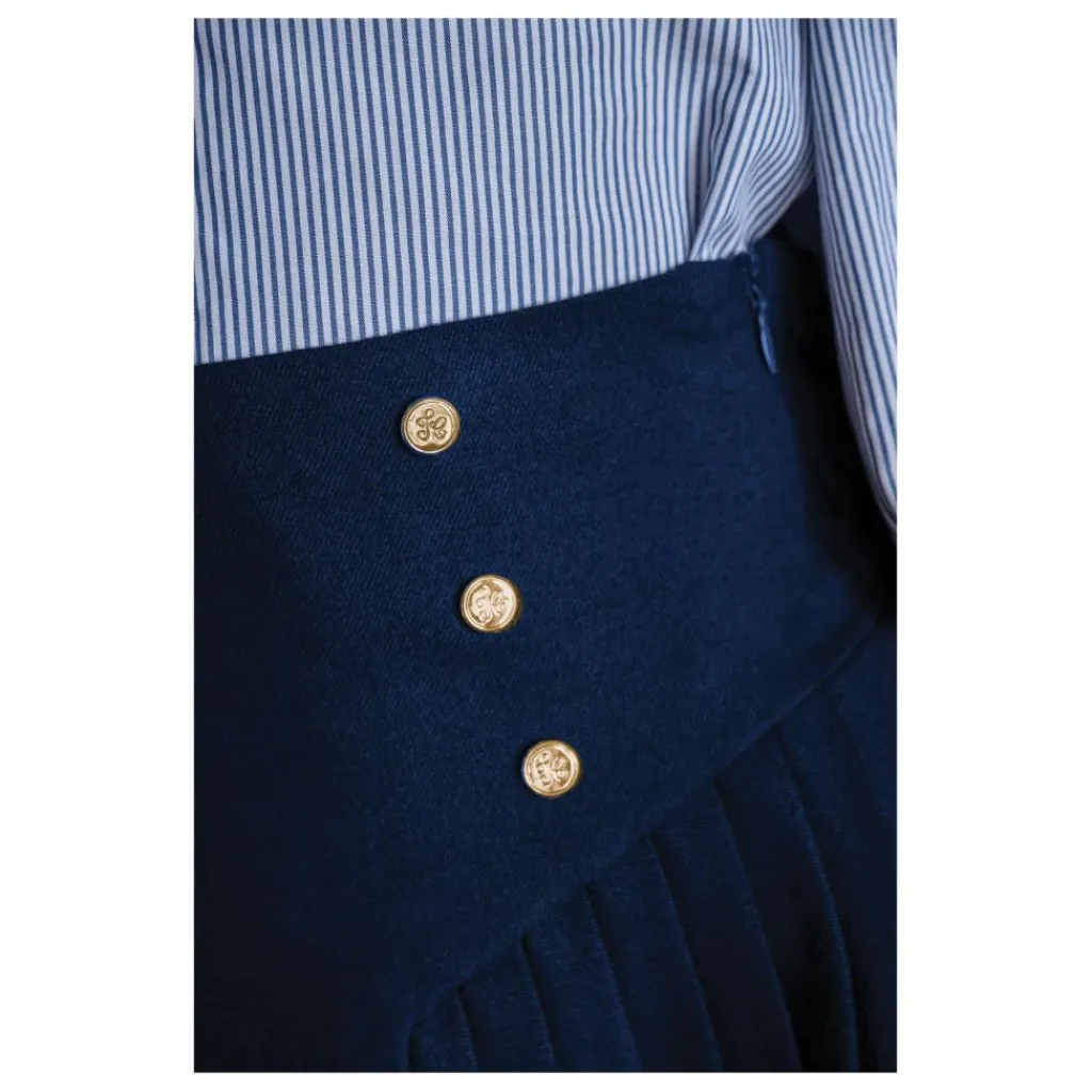 - Cette jupe pour junior fille, en coloris marine, se distingue par ses plis religieux élégamment placés sur les côtés. Elle est sublimée par deux rangées de boutons dorés sur le devant, ajoutant une touche chic et sophistiquée. Une pièce idéale pour les occasions spéciales comme pour les looks du quotidien.