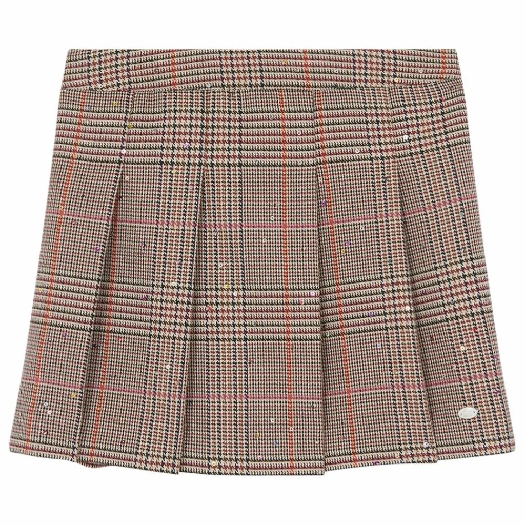- Cette jupe pour junior fille, en coloris sable, est à la fois élégante et fun avec son imprimé à carreaux et ses sequins multicolores délicatement parsemés sur l’ensemble. Plissée pour un effet dynamique, elle ajoutera une touche de brillance et de style à toutes les tenues. Parfaite pour un look à la fois chic et plein de peps.