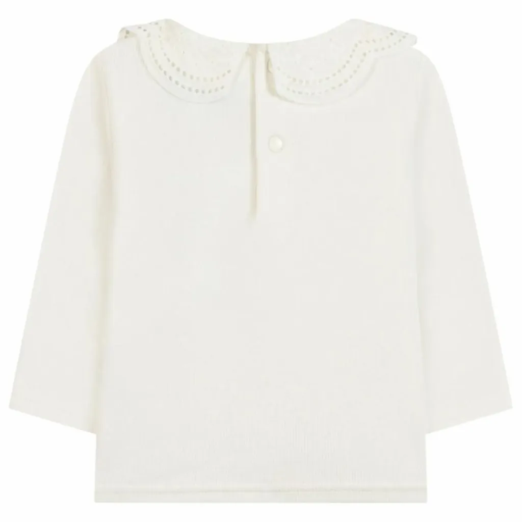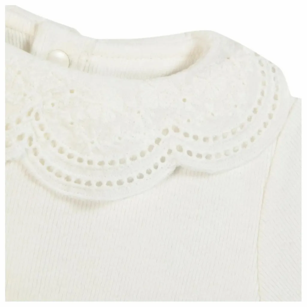 - Ce t-shirt côtelé à manches longues est idéal pour tous les jours. Sa couleur écru s’accorde parfaitement avec de nombreuses tenues. Son élégant col en dentelle apportera une touche délicate au look de votre petite fille.