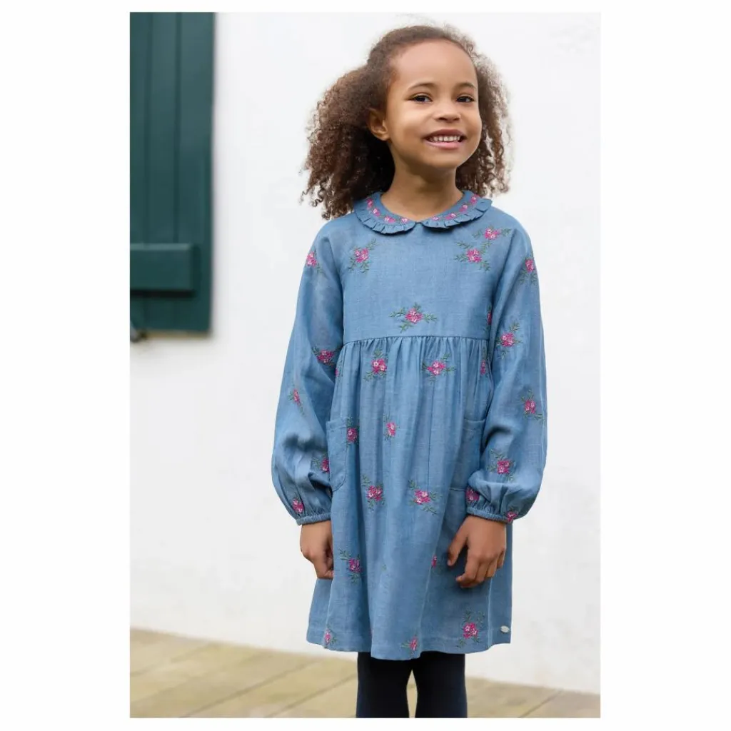 - Cette robe pour junior fille, en chambray couleur denim, est rehaussée de délicates fleurs coloris magenta qui lui apportent une touche poétique. Dotée d’un col volanté et de deux poches plaquées sur le devant, elle combine charme et décontraction pour un look du quotidien tout en douceur.