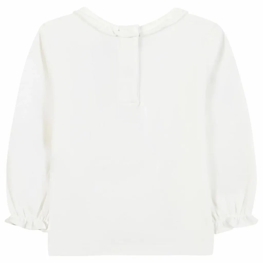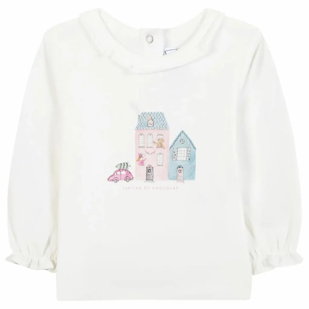 - Ce t-shirt manches longues écru pour bébé fille séduit par son charmant volant au niveau du col et du bas des manches, apportant une touche de délicatesse à son design. Son illustration poétique représentant une maison de campagne dans les tons de prune évoque douceur et rêverie. Confectionné dans une matière douce, il assure un confort optimal pour accompagner bébé tout au long de la journée.