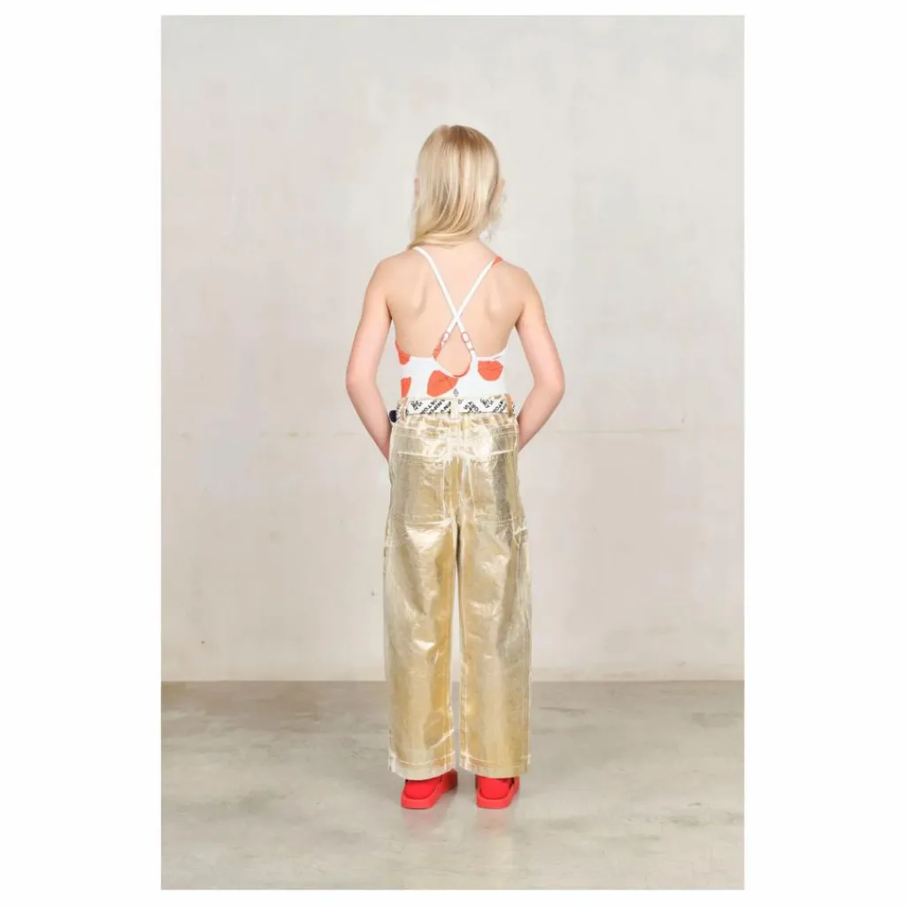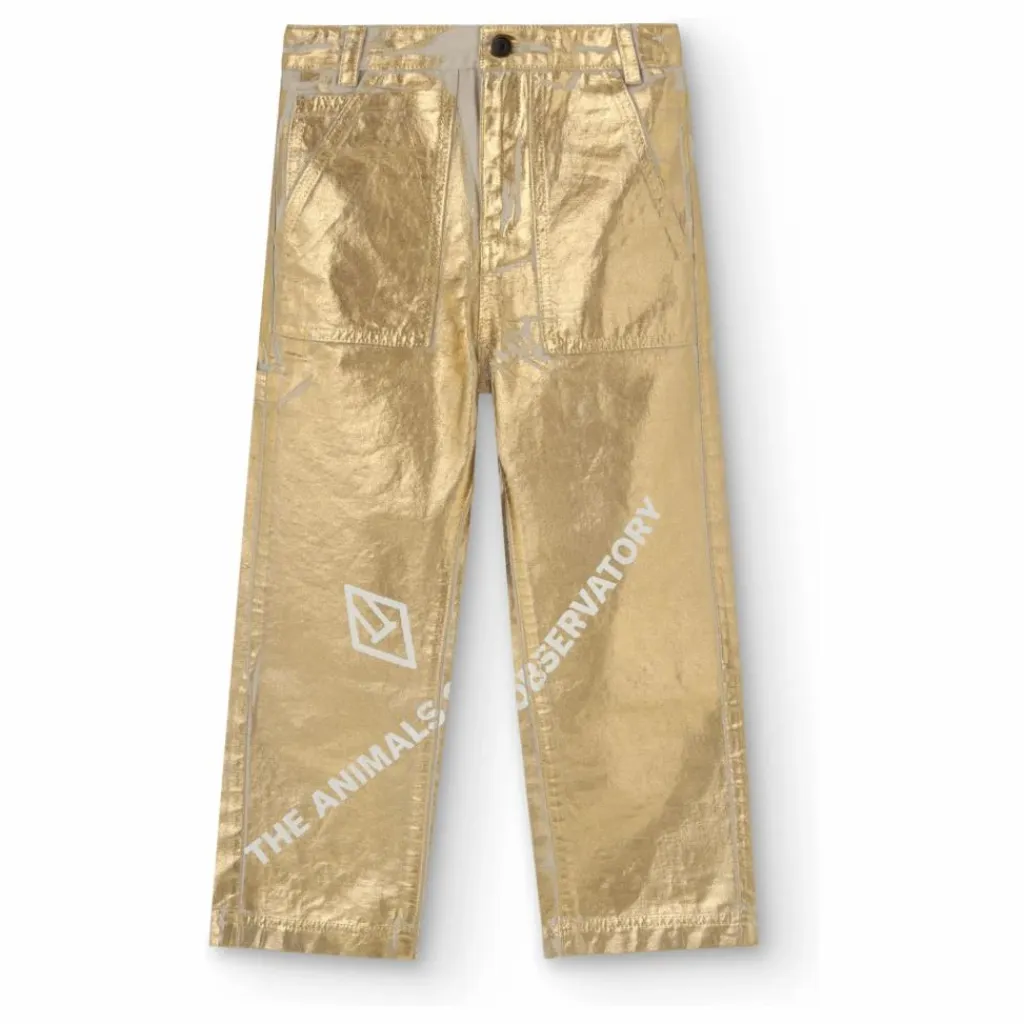 - Pantalon en métal doré. Brillant et tendance, avec l’imprimé The Animals Observatory sur la jambe, parfait pour les enfants à la pointe de la mode.