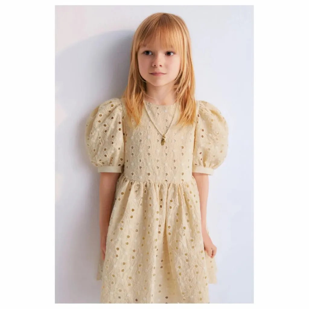 - Robe Creta, notre best-seller, en coton mélangé brodé de couleur macadamia. Robe à manches bouffantes et jupe évasée.