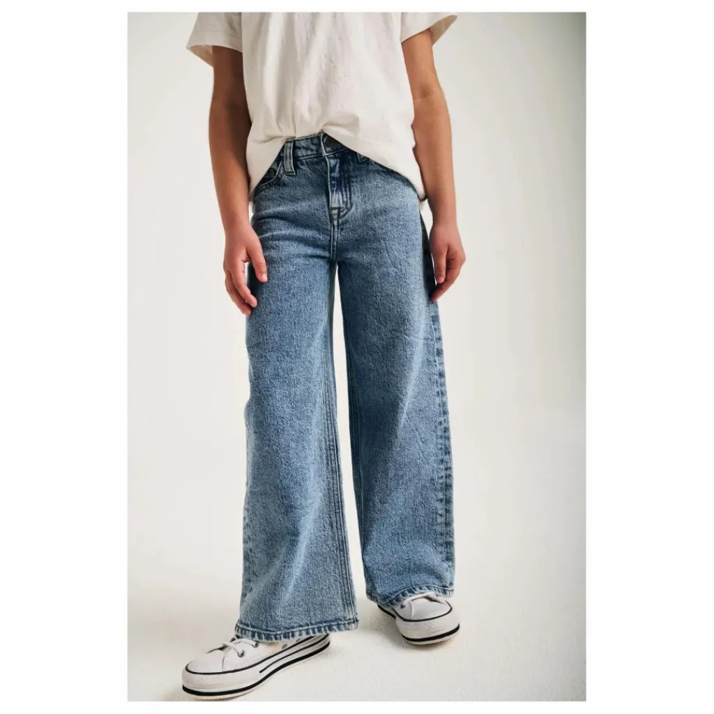 - Ce jean à cinq poches, en denim clair délavé, a une coupe large.