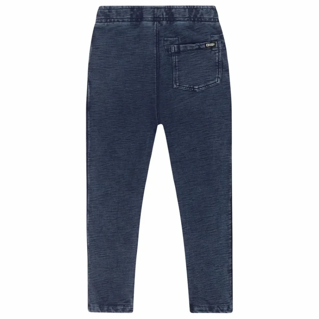 - Ce pantalon de survêtement confortable pour garçon allie style et praticité. Fabriqué en 100% coton avec un tissu sweat indigo doux, ce pantalon est un parfait équilibre entre décontraction et tendance. Il présente une coupe fuselée et une taille élastique avec un cordon de serrage contrasté pour un ajustement optimal. Les poches avant et arrière ajoutent des détails fonctionnels, tandis que l’effet subtilement délavé lui confère une touche de modernité.