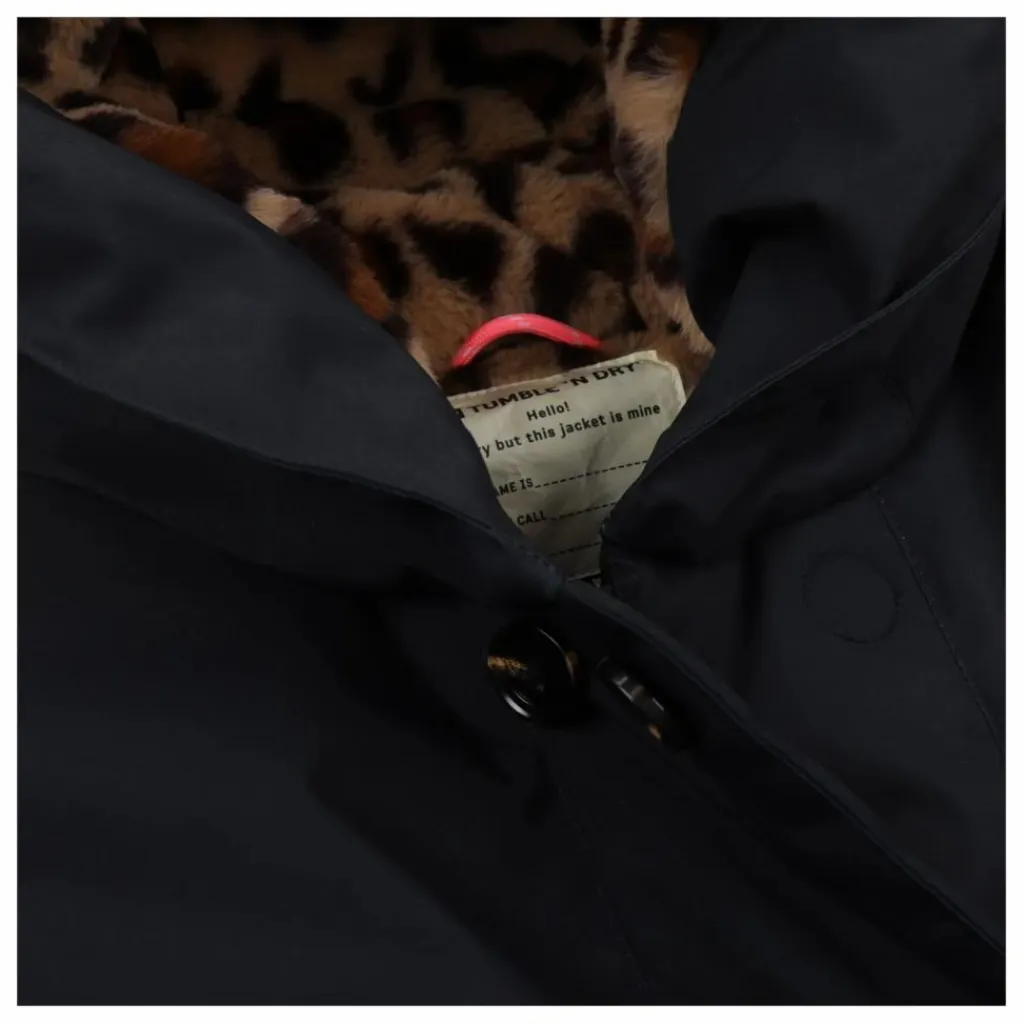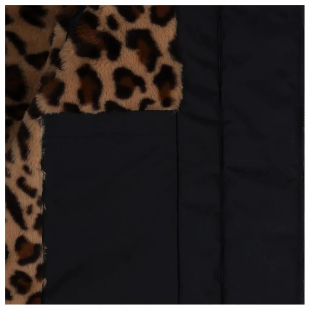 - Ce manteau d’hiver bleu foncé est doté d’une fermeture à glissière, d’une fermeture à bouton magnétique, de poignets côtelés, de deux poches à rabat avec fermeture à bouton-pression, d’une doublure en fausse fourrure douce à imprimé léopard et d’une poche intérieure à fermeture velcro. La doublure est en rembourrage Sorona et le manteau a une finition Bionic eco.