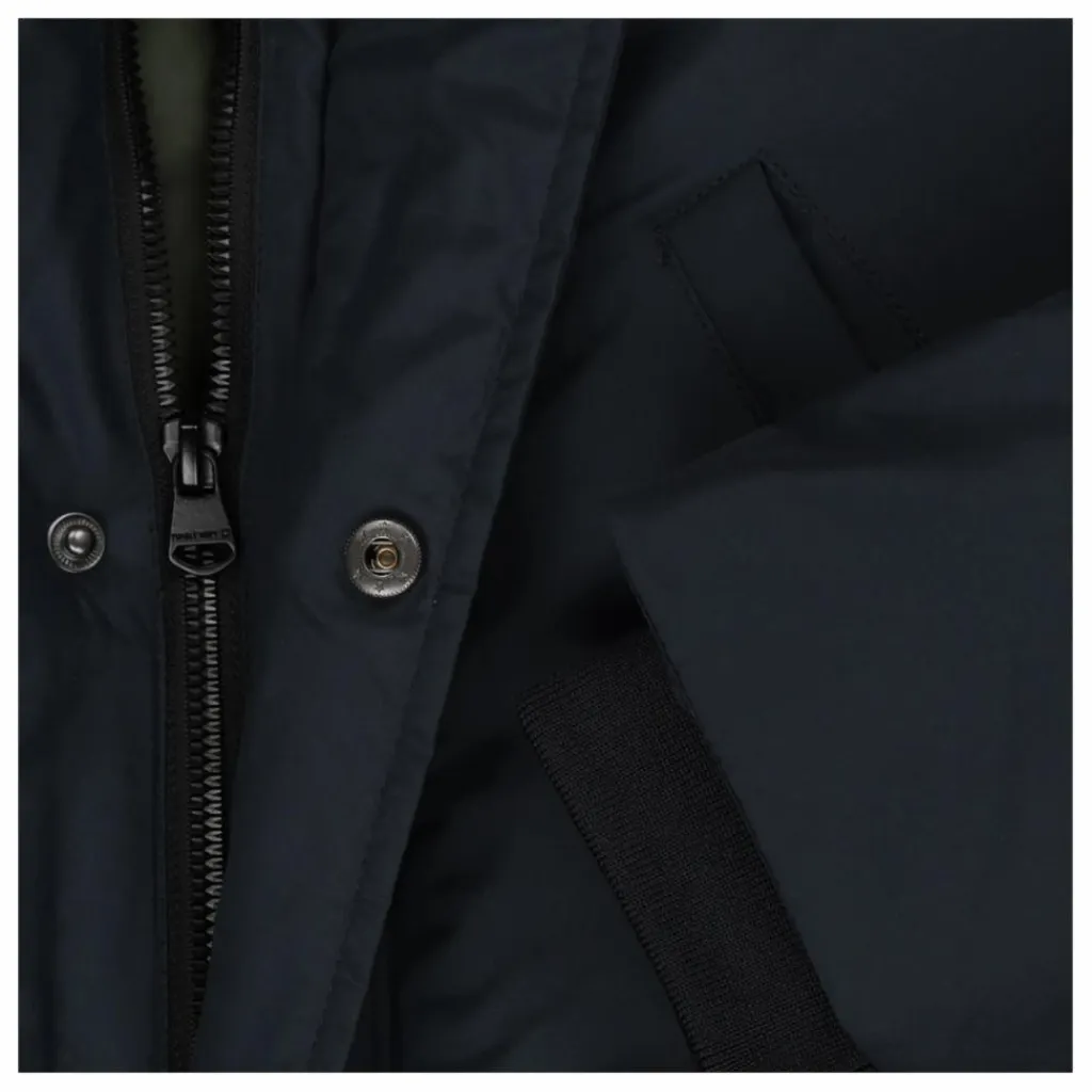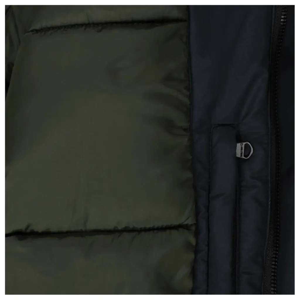- Ce manteau d’hiver gris foncé est fabriqué en 100% polyester recyclé et a un intérieur vert foncé. En outre, le manteau est doté d’une fermeture à glissière et à boutons-pression, d’une capuche, de deux poches sur la poitrine et de deux poches latérales sur le devant.