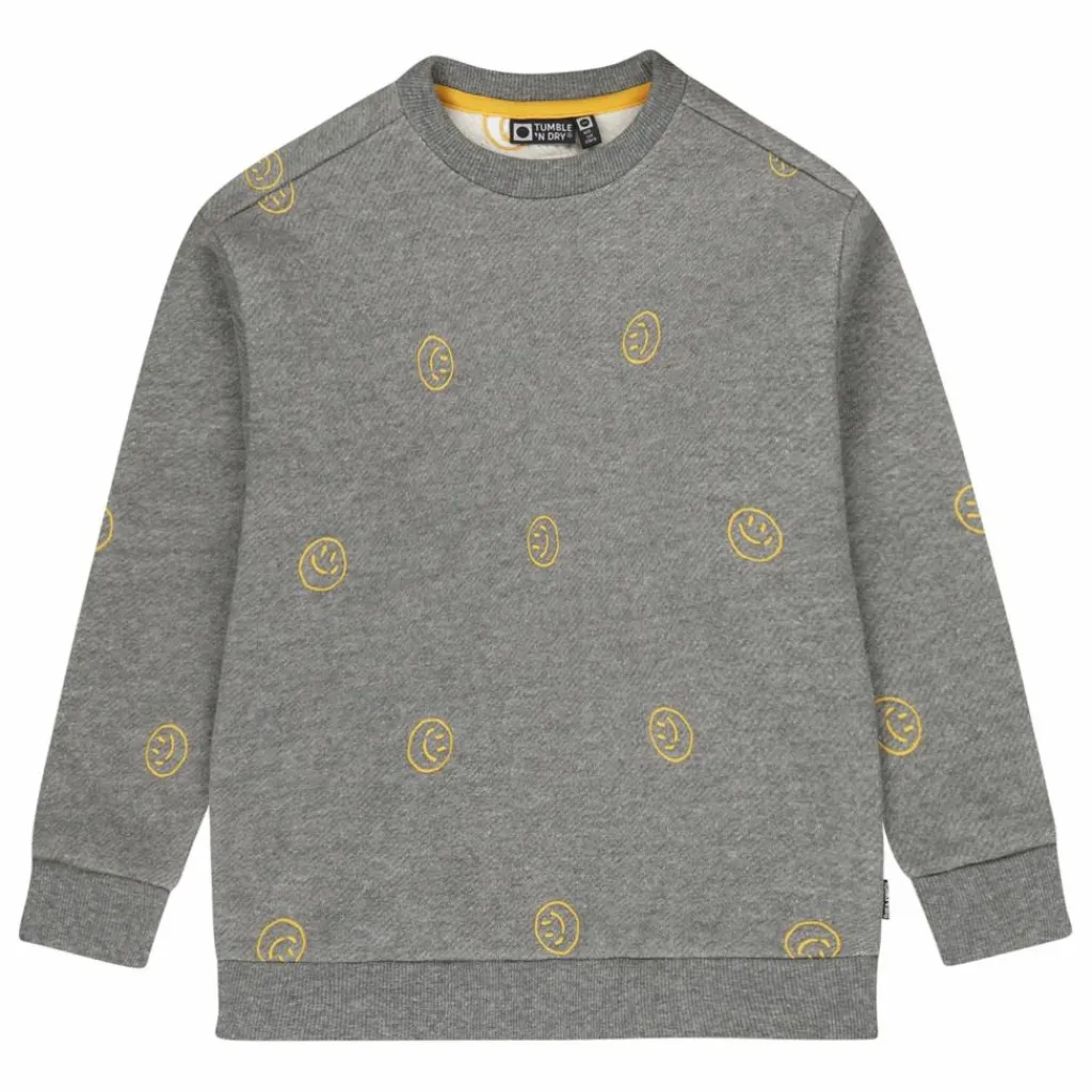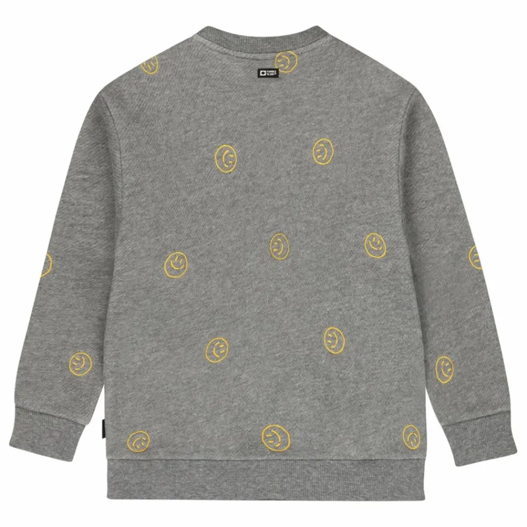 - Ce pull gris mélangé est orné de smileys brodés sur tout le pourtour. De plus, il est doté de poignets côtelés et d’une coupe surdimensionnée. Le pull est en coton biologique.