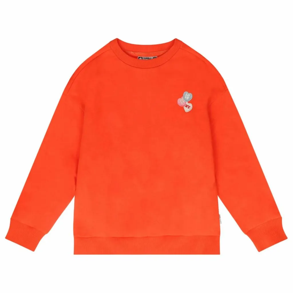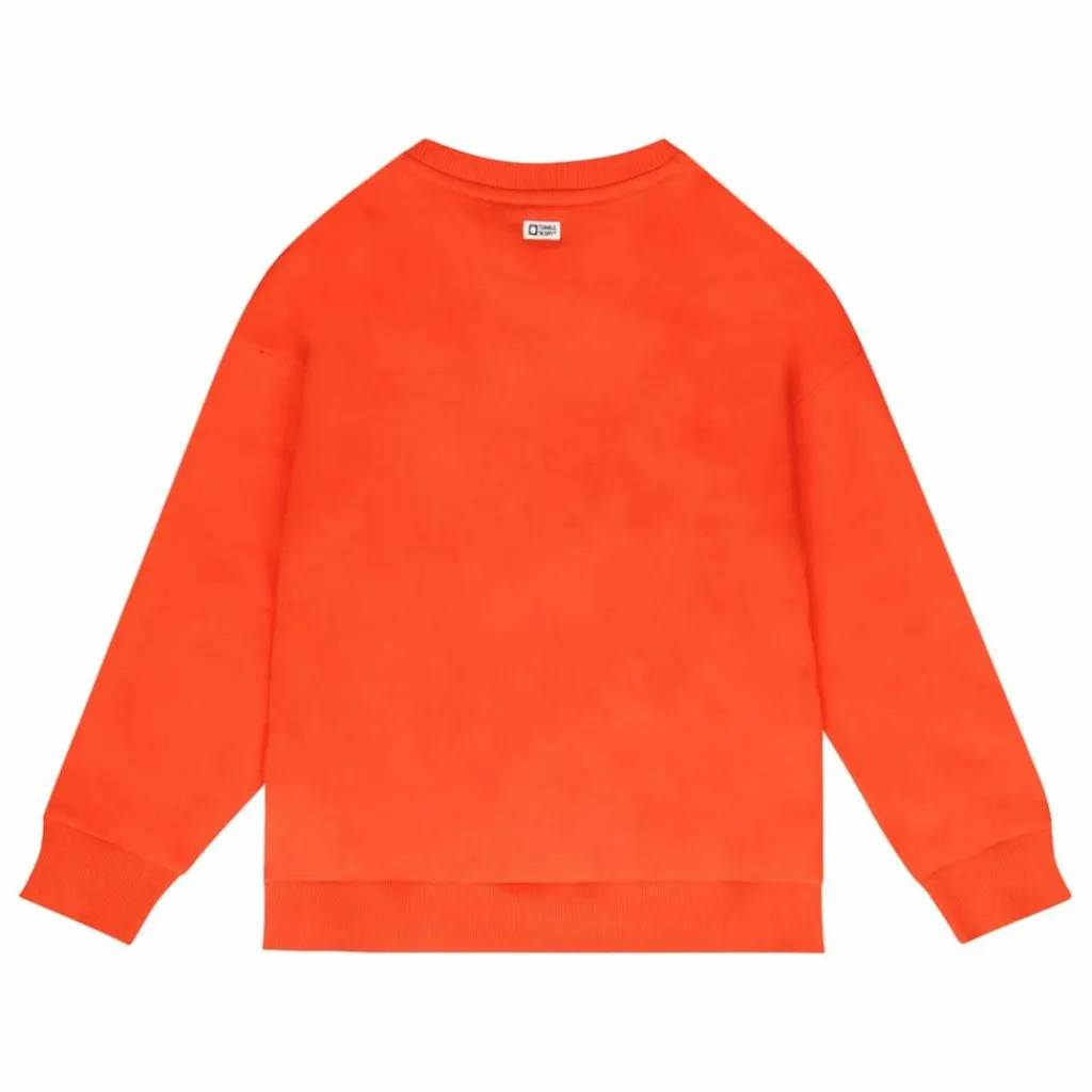 - Ce pull-over rouge-orange a une coupe surdimensionnée, des poignets côtelés et une broderie sur la poitrine. Le pull est en coton biologique.