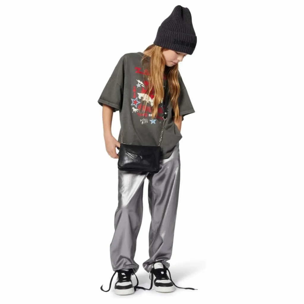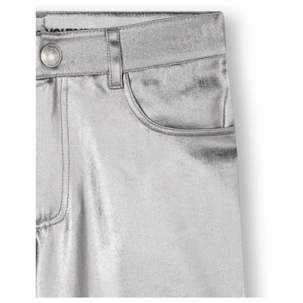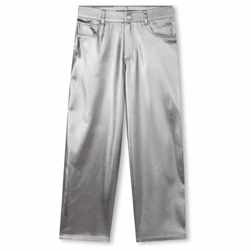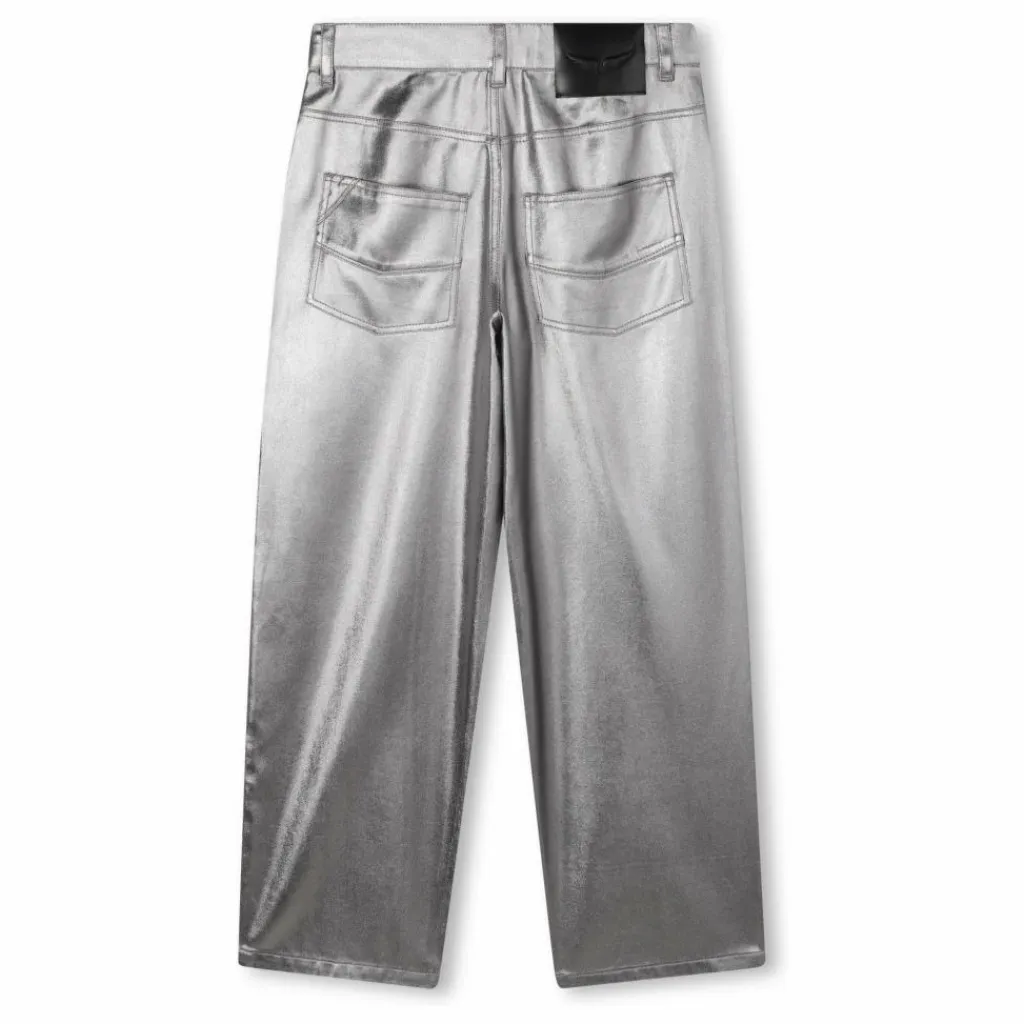 - Pantalon en sergé argenté, coupe large, étiquette ceinture dos.