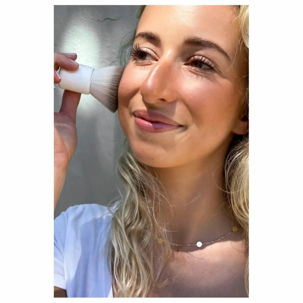 - Après avoir prélevé la poudre, procédez par de larges mouvements circulaires en commençant par le front. Balayez tout le visage du centre vers l’extérieur. Bien nettoyer le pinceau après utilisation, puis le laisser sécher à l’horizontal pour préserver chacun des côtés.