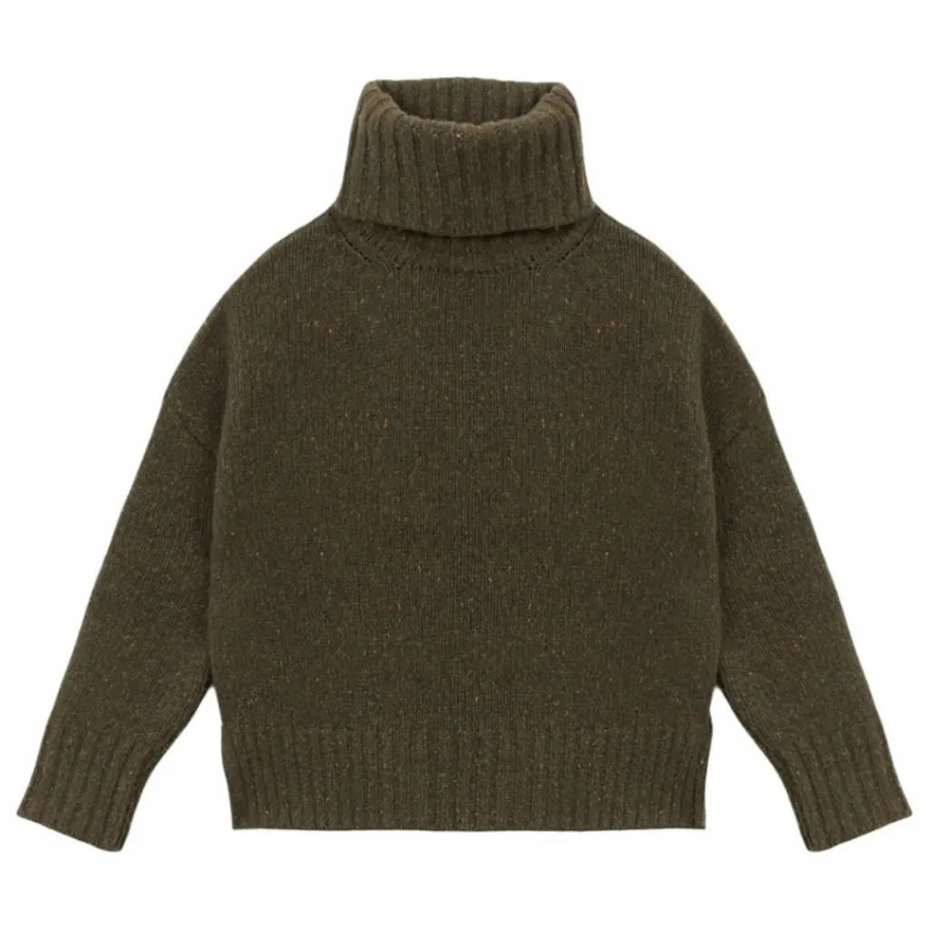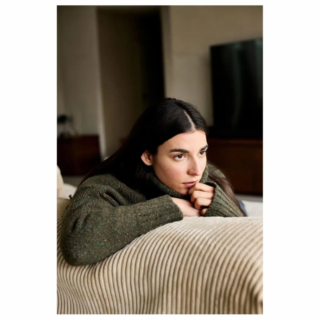 - Pull col roule femme . – Maille tricotee majoritairement de laine. – Col montant. – Forme droite et ample . – Emmanchures decalees, manches longues. – Finition bord cote au col, aux manches et bas de corps. – Broderie « pois bleu » en bas du corps. – Existe en coloris ficelle et kaki.