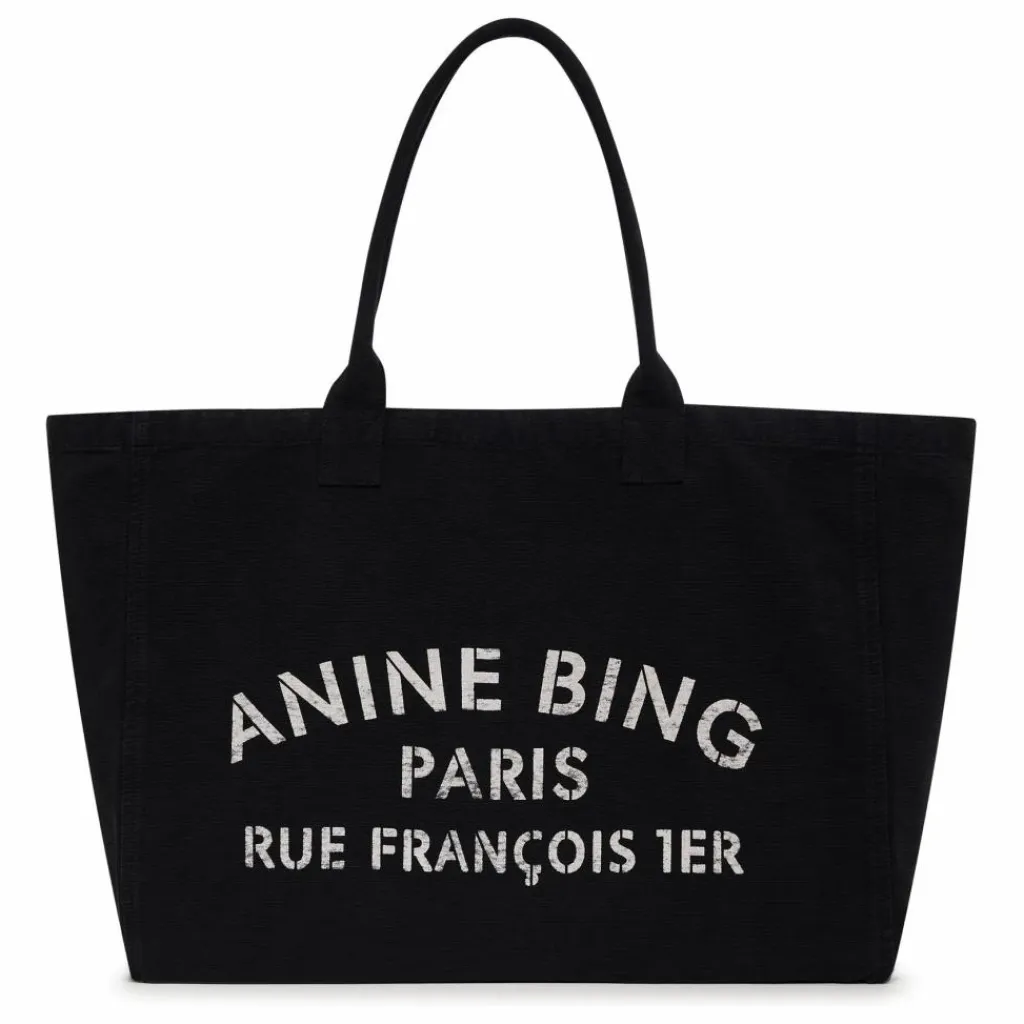 - Fourre-tout rectangulaire en toile noire avec marquage sérigraphié ANINE BING PARIS RUE FRANCOIS 1ER en blanc.
