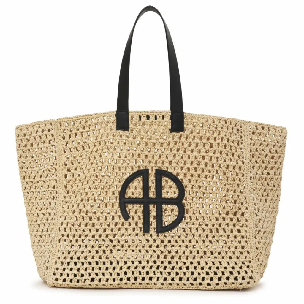 - Le Large Rio Tote est un indispensable de la journée à la plage, fabriqué à partir d’une matière tissée en herbes marines et doté de deux sangles noires pour un transport facile. Ce modèle saisonnier n’est pas doublé et porte le monogramme audacieux d’ANINE BING en noir au centre de l’avant.