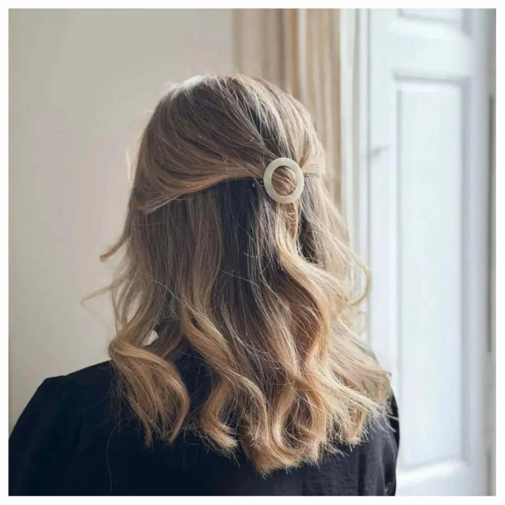 Rassemblez la moitié supérieure de vos cheveux et attachez-la avec la barrette ronde nacrée. Laissez le reste des cheveux libres pour une coiffure élégante mais décontractée, idéale pour le quotidien ou une sortie spéciale.2. Chignon bas élégant
