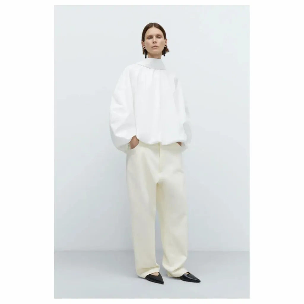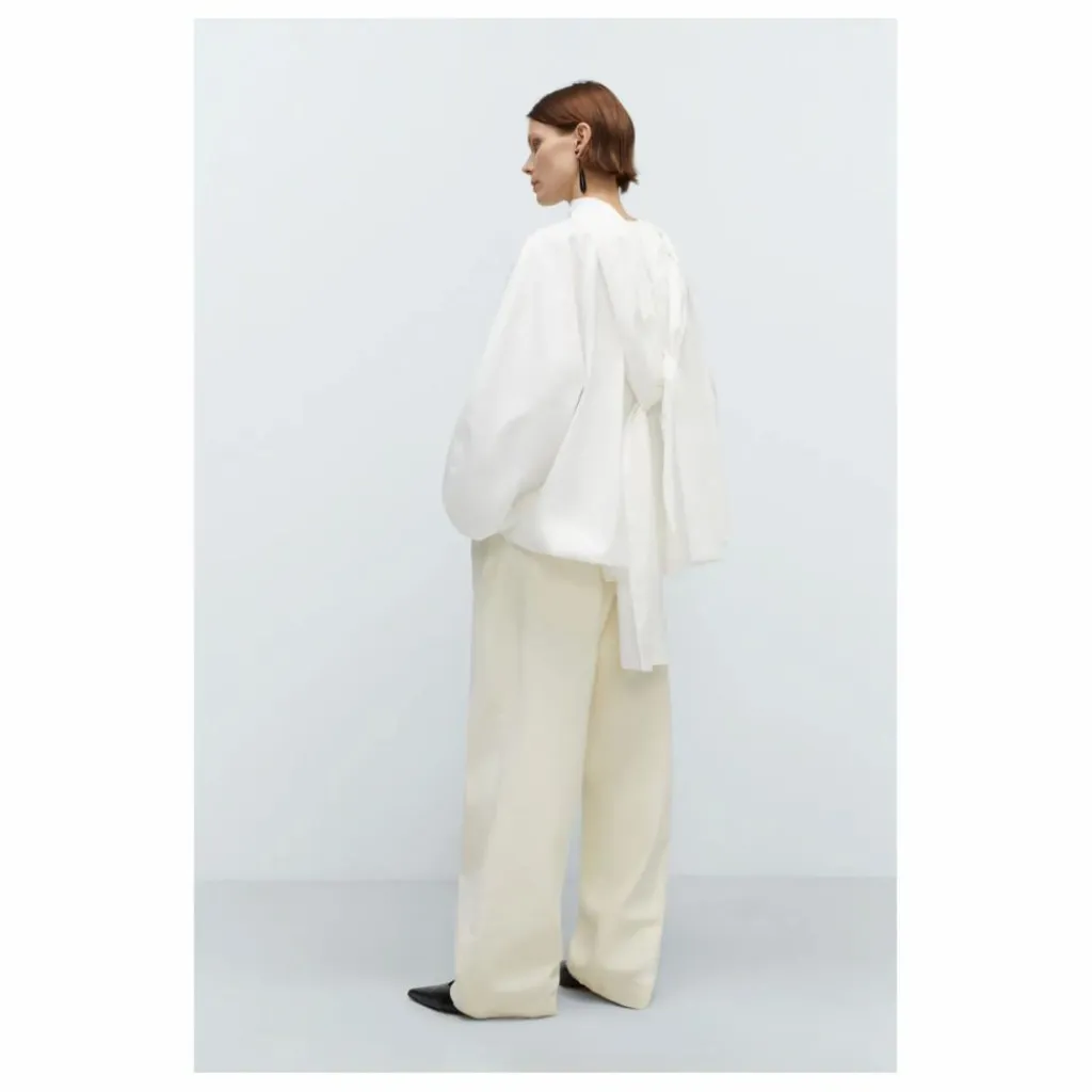 - Une silhouette ballon définit cette belle chemise, agrémentée de manches volumineuses et d’un lien polyvalent au niveau du cou. Elle se ferme au dos par un petit bouton qui termine l’ouverture en trou de serrure en haut. Les poches latérales ajoutent un confort supplémentaire, tandis que la texture du tissu est douce au toucher.