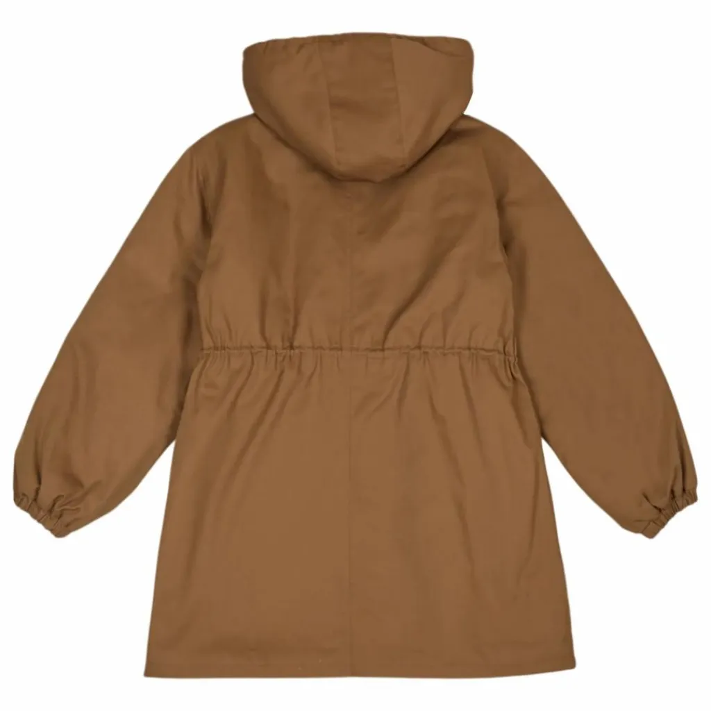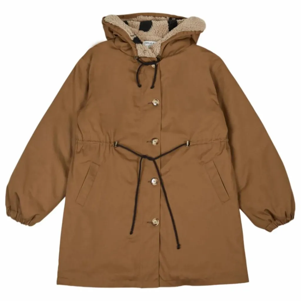 - Parka en coton châtaigne doublée en fourrure synthétique imprimée de pommes noires.