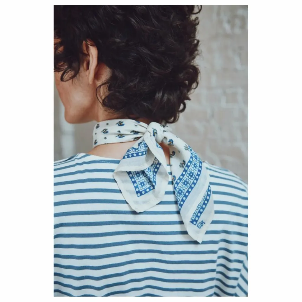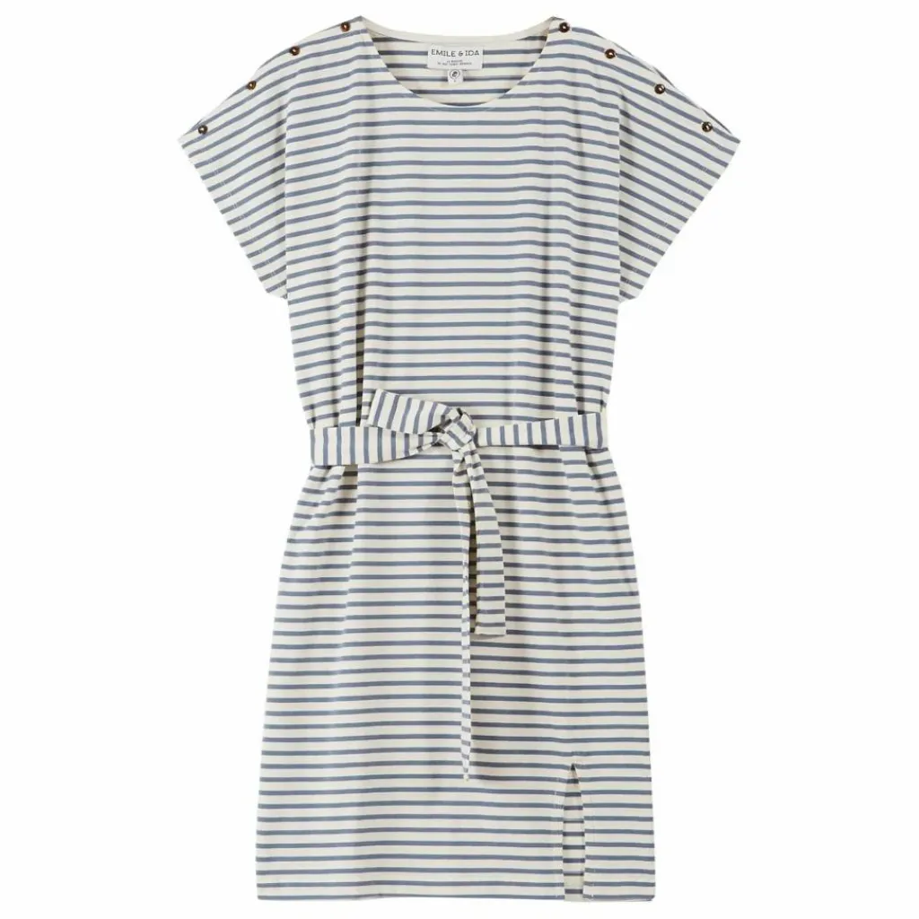 - Robe droite en jersey de coton biologique blanc, ornée de rayures bleues. Sa coupe droite, minimaliste et intemporelle, est sublimée par des détails pratiques et élégants : une fente d’aisance à la base pour une liberté de mouvement optimale et une encolure ras-du-cou qui s’ouvre discrètement sur une épaule. Pour l’équilibre, des boutons décoratifs sont ajoutés sur l’autre épaule.