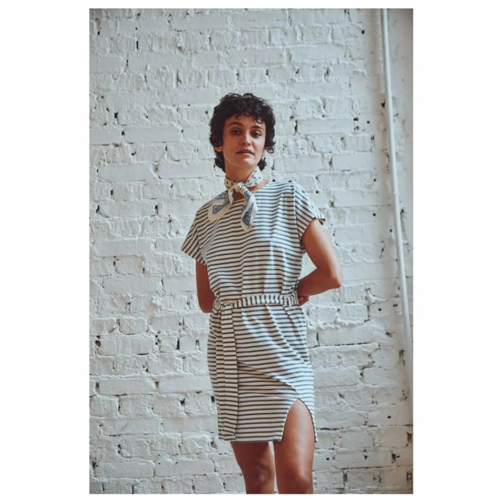Une robe marinière moderne, prête à vous accompagner dans vos aventures estivales et à devenir le témoin de vos histoires que vous écrirez entre ses lignes.