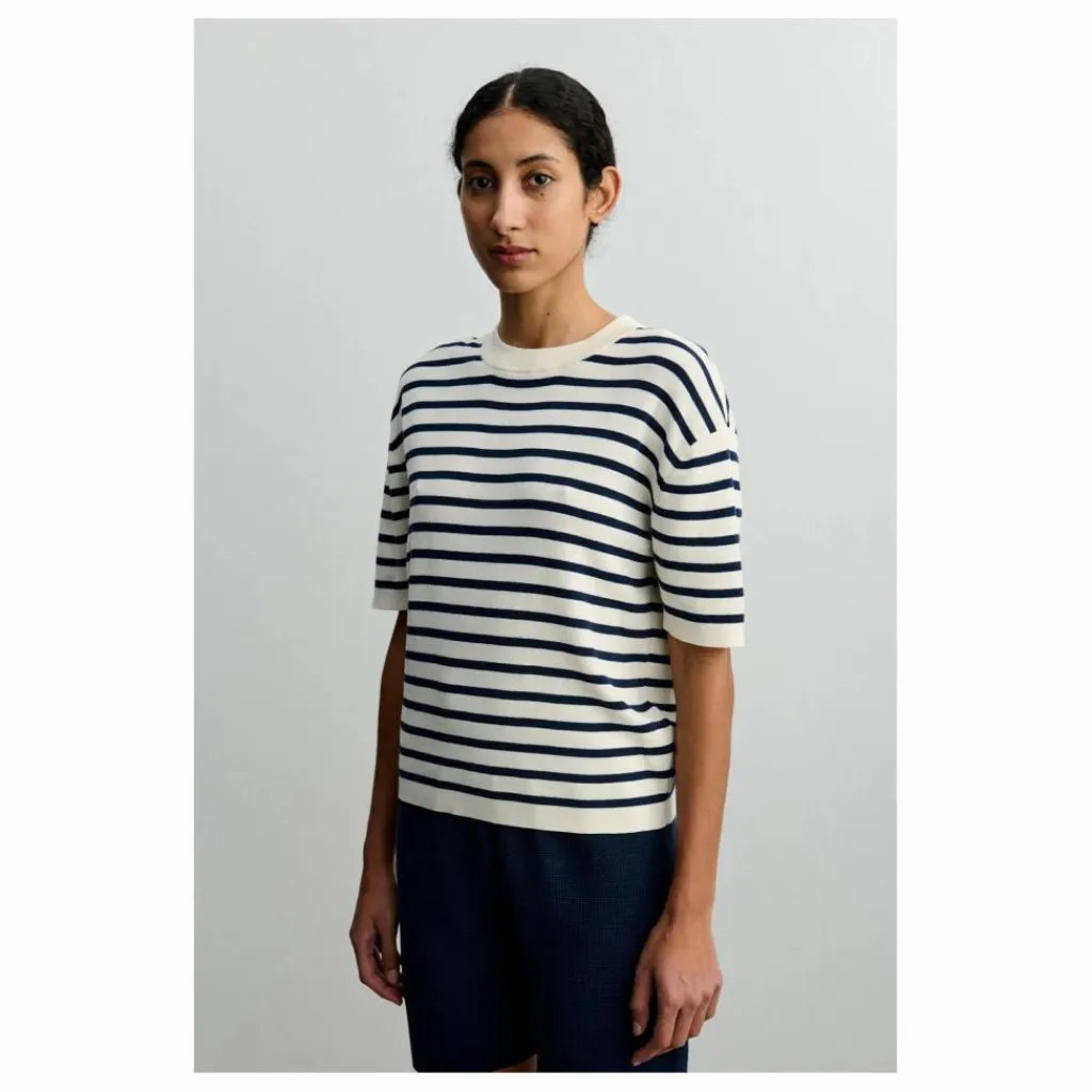 Fabriqué en coton biologique, ce tee-shirt présente des manches courtes et un col double épaisseur. Il a une coupe ample et est tricoté dans une structure côtelée 1×1 avec des rayures classiques teintes dans le fil sur toute la surface.