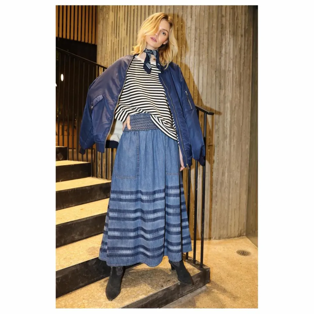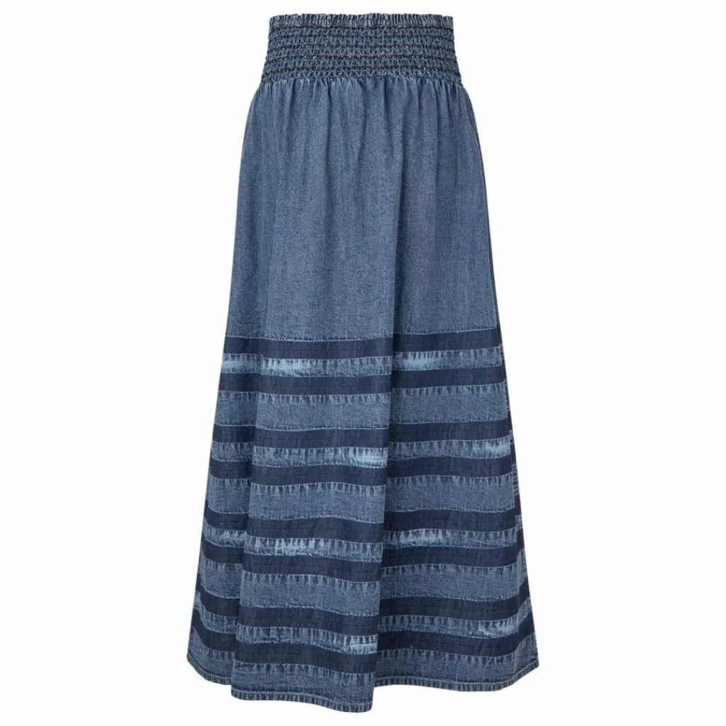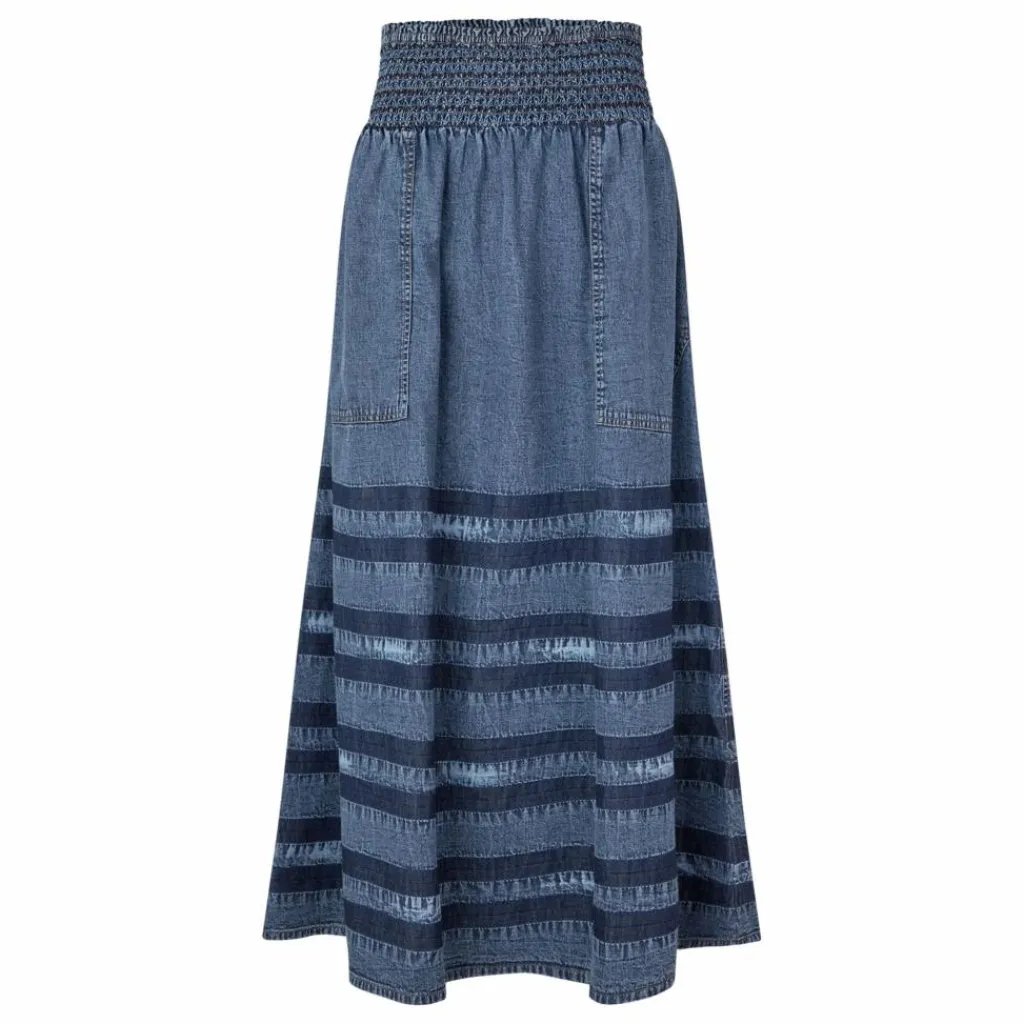- – Jupe longue en denim avec effet tie-dye – Large ceinture smockée – Forme légère A-line – Deux poches plaquées sur le devant – Effet de rayures lavées dans les tons bleus – Coupe confortable et souple