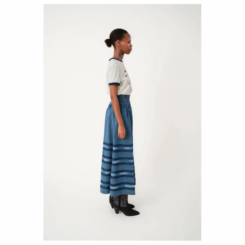 - AmondLL est une jupe longue unique en denim doux avec des rayures décoratives. Elle est dotée d’une large ceinture smockée pour une coupe confortable et souple. La jupe a une forme légère en A, deux poches plaquées sur le devant et un look décontracté avec des effets de délavage horizontaux inspirés du tie-dye dans le tissu.