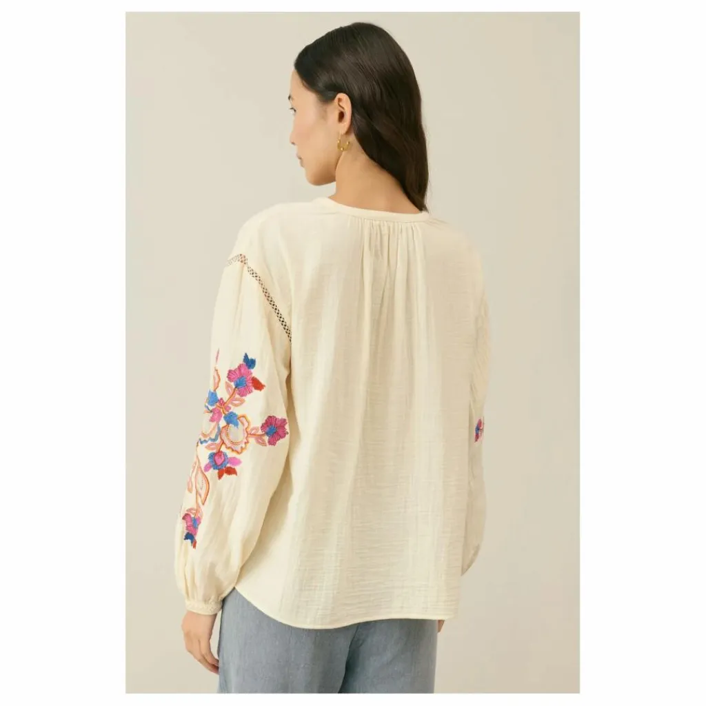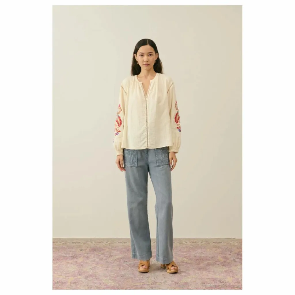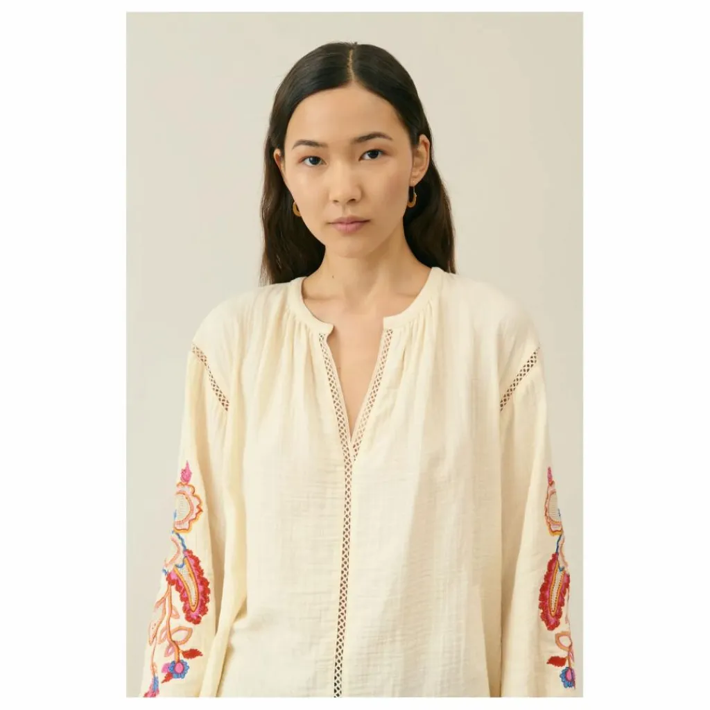 Manches longues bouffantes avec grandes broderies placées et ajourées à la main.Cette pièce a été imaginée par Marie Pidancet et son équipe passionnée.