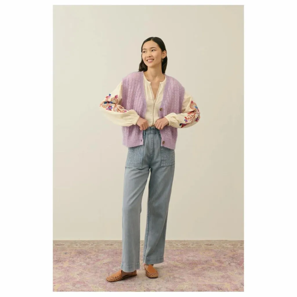 Détails de dentelle ajourée devant, aux emmanchures et sur les poignets.