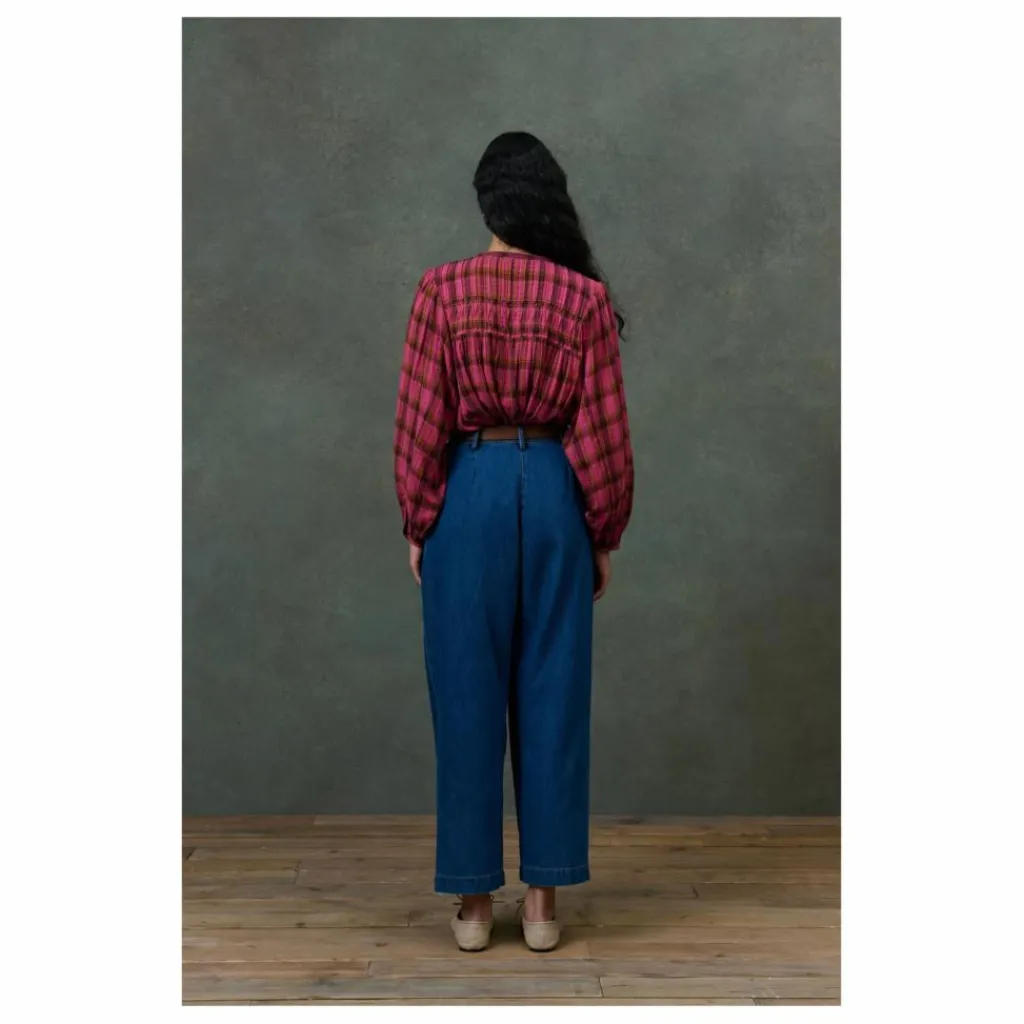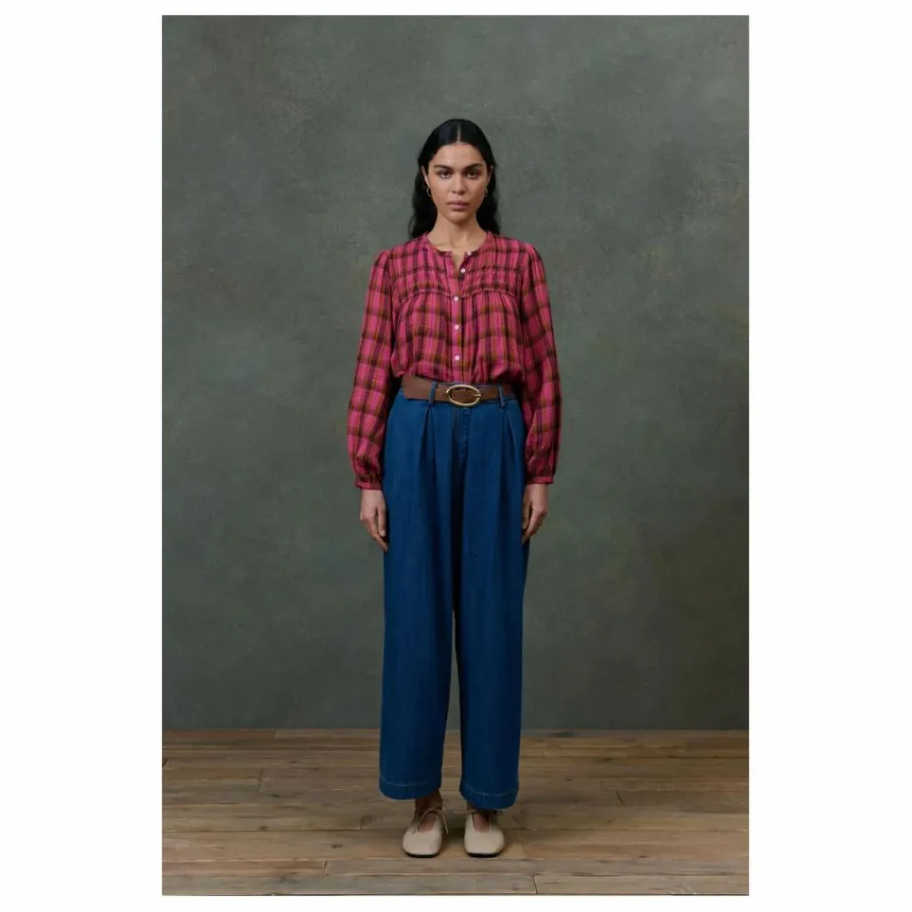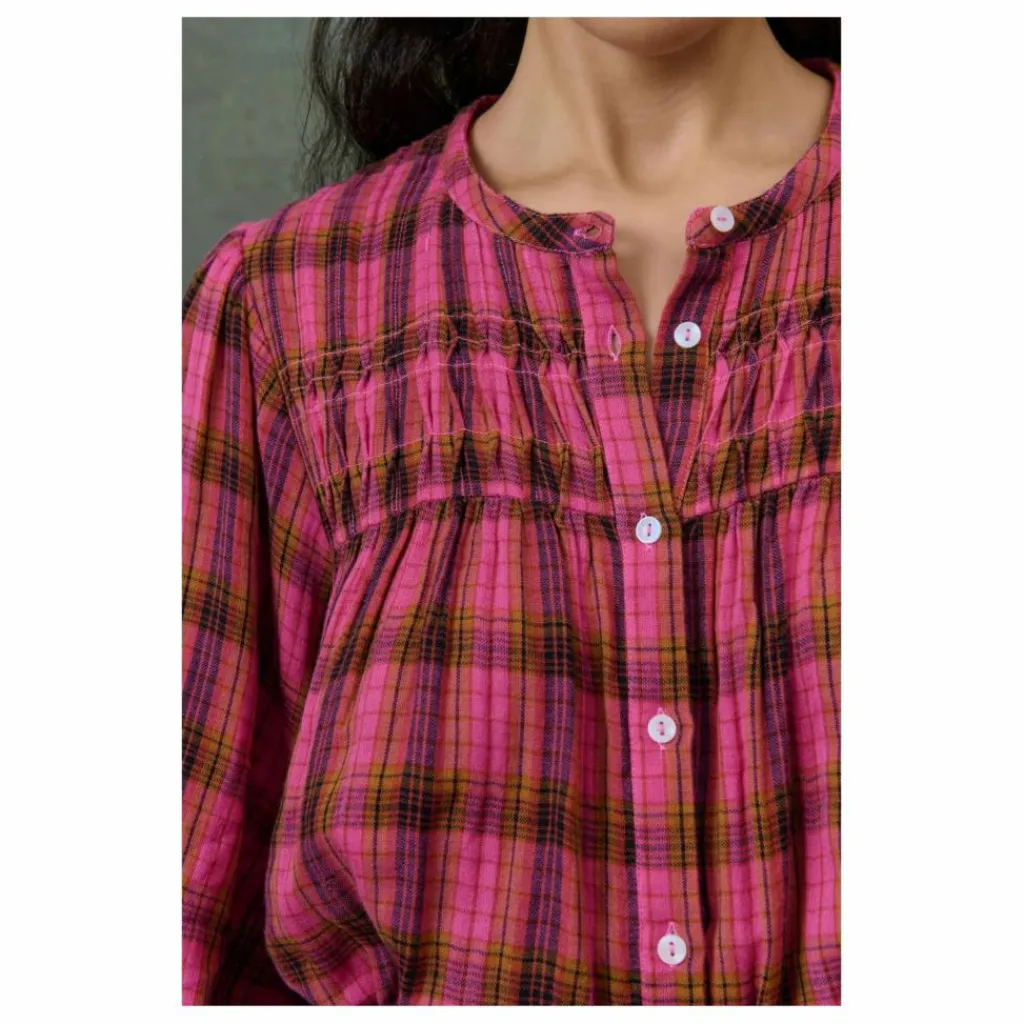 Blouse à carreaux en double gaze de coton tissé teint.