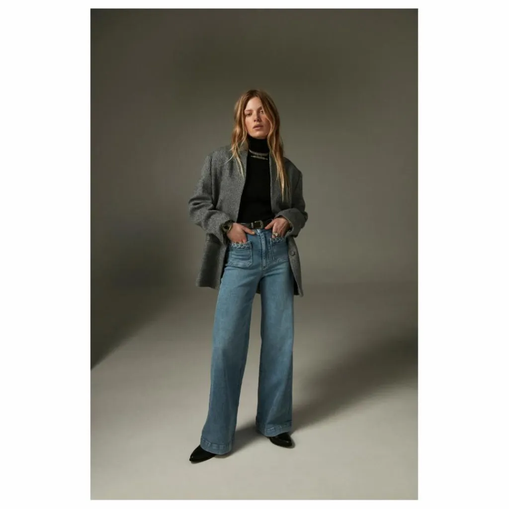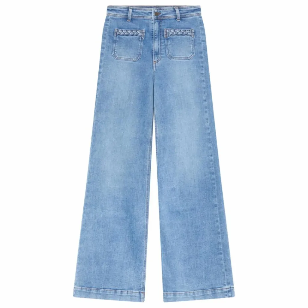 - Pantalon en denim de coton lavé, à taille haute et coupe légèrement évasée. Sa teinte indigo clair et ses détails tressés aux poches lui donnent un charme artisanal. Doux et fluide, il allie confort et élégance dans un style raffiné et décontracté.
