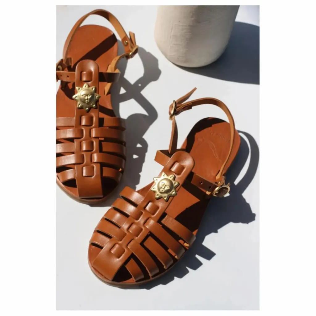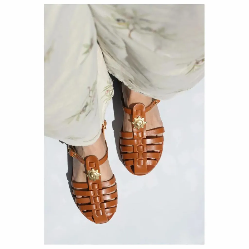 - Les sandales Fisherman en cuir camel « Soleil » séduisent par leur douceur et leur allure lumineuse.