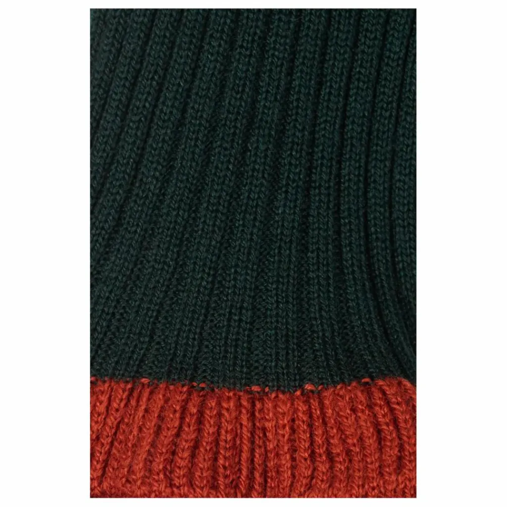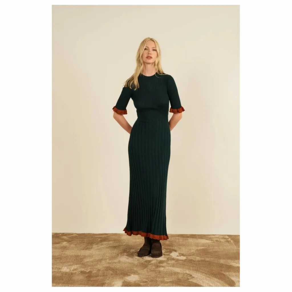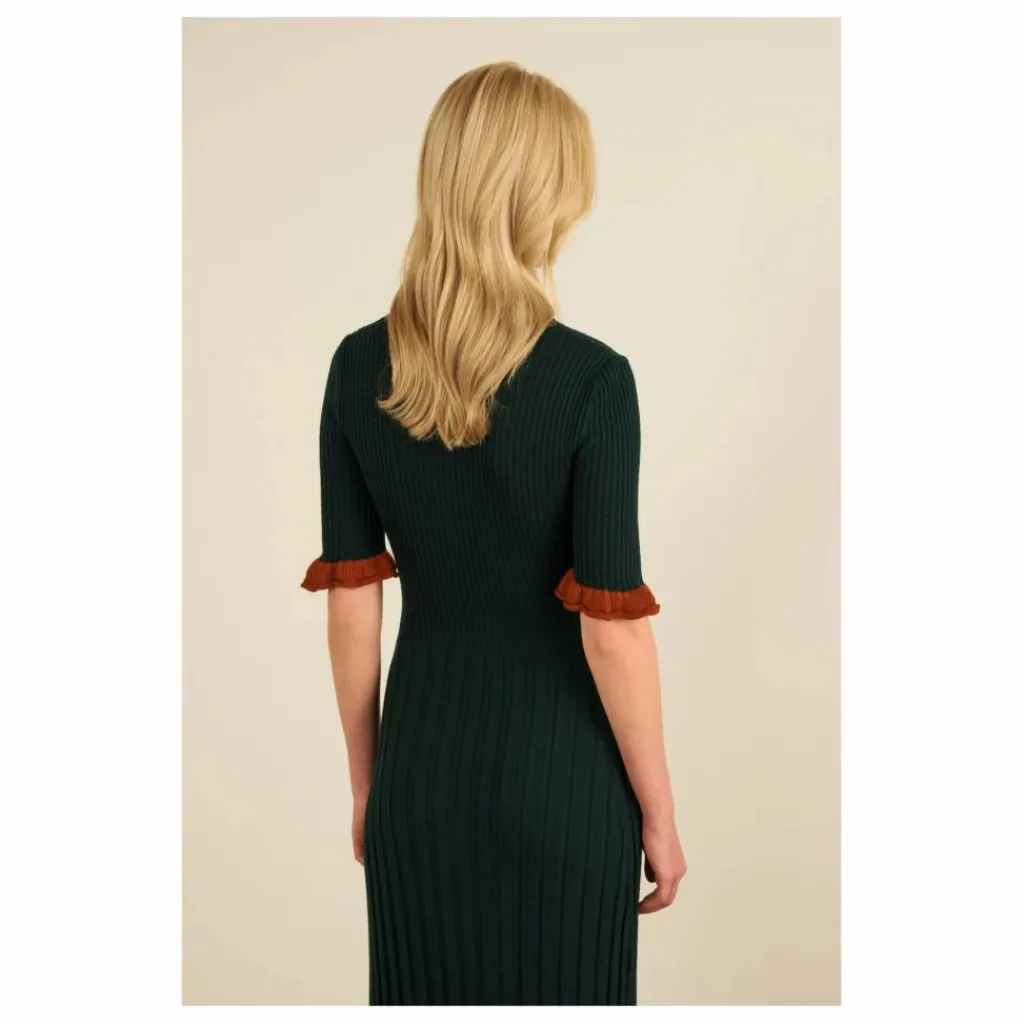 - La robe Magda est une robe longue, tricotée et près du corps avec un col rond – Elle a de petits volants bordeaux sur les manches et le bas de la robe – Réalisée en laine mérinos vert foncé