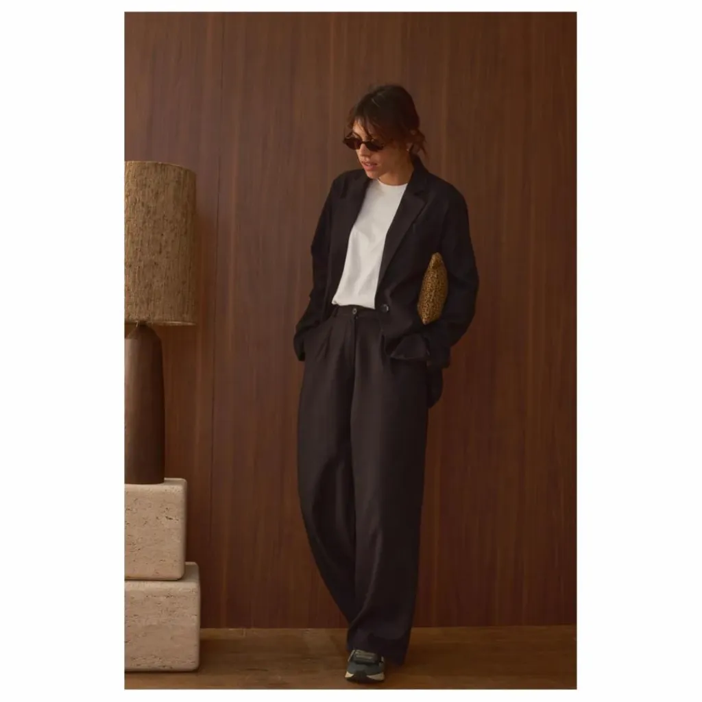 - Le pantalon Nino est un indispensable du vestiaire moderne. Sa coupe large et fluide assure confort et aisance. Il présente une taille mi-haute avec passants, des plis plats à l’avant, et des poches italiennes pour un style à la fois structuré et décontracté.