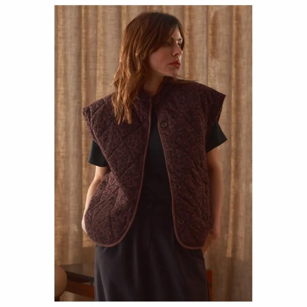 - Le gilet matelassé qui se démarque par son motif léopard chocolat et sa silhouette structurée. Il allie chaleur et légèreté. Son col rond, ses larges épaules et sa coupe sans manches en font une superposition idéale.
