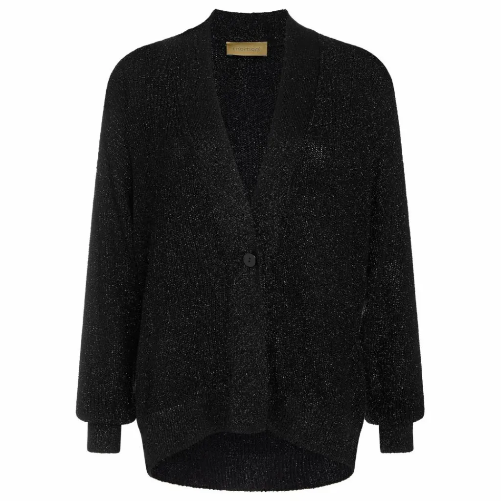 - Cardigan avec ajustement au point épi travaillé à l’avant du fil de viscose matallizzata. Bord à bande en côte élastique 1×1. Bas de la manche et du dessus en côtes 1×1. Boutonnage à un bouton en nacre.